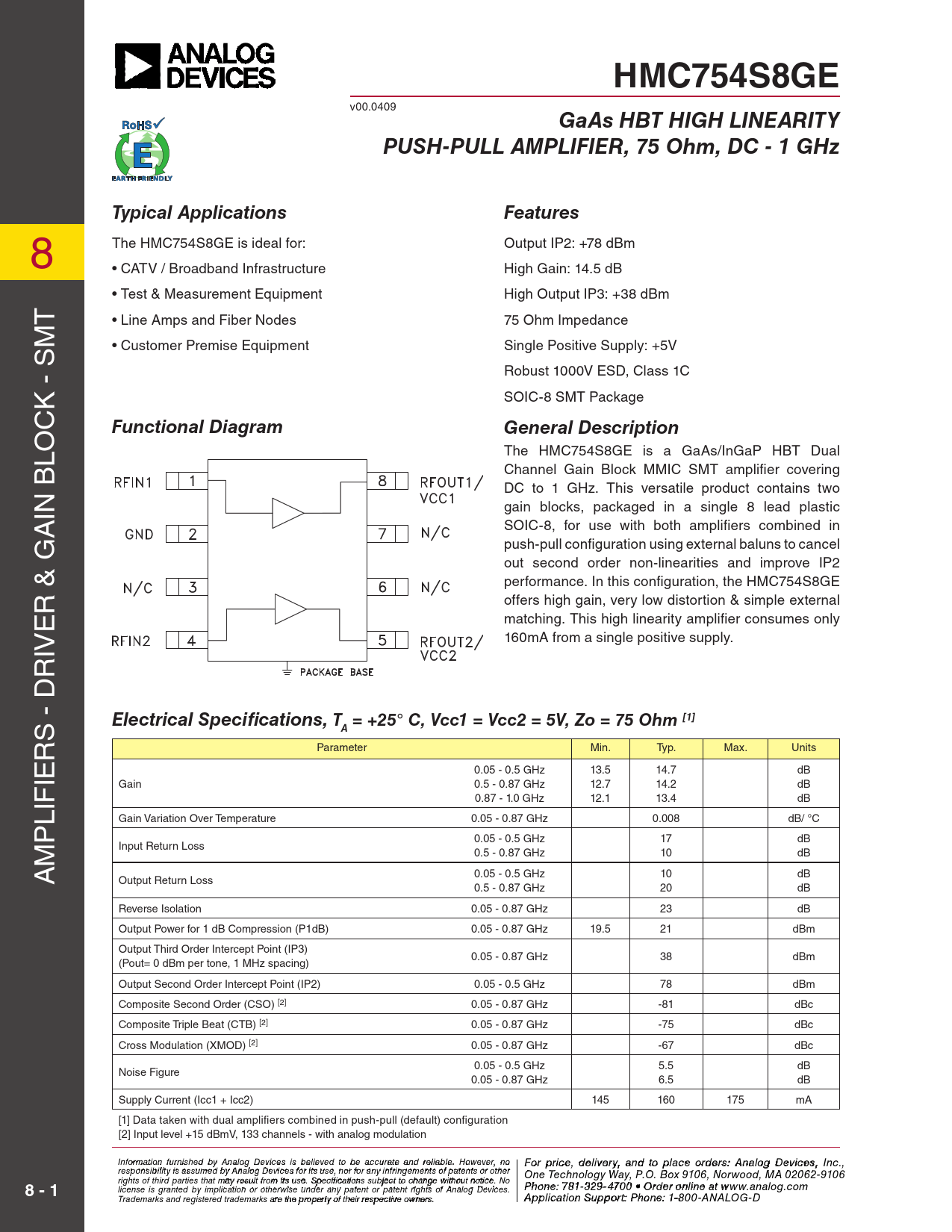 HMC754S8GE v00.0409 GaAs HBT HIGH LINEARITYPUSH-PULL AMPLIFIER, 75 Ohm, DC - 1 GHzTypical ApplicationsFeatures 8 The Hmc754s8Ge is ideal for: output ip2: +78 dBm • cATv / Broadband infrastructure High Gain: 14.5 dB • Test & measurement equipment High output ip3: +38 dBm T • line Amps and fiber nodes 75 ohm impedance m s • customer premise equipment single positive supply: +5v robust 1000v esD, class 1c k - soic-8 smT package c Functional DiagramGeneral Description lo The Hmc754s8Ge is a GaAs/inGap HBT Dual channel Gain Block mmic smT amplifier covering Dc to 1 GHz. This versatile product contains two in B gain blocks, packaged in a single 8 lead plastic A soic-8, for use with both amplifiers combined in push-pull configuration using external baluns to cancel out second order non-linearities and improve ip2 performance. in this configuration, the Hmc754s8Ge r & G offers high gain, very low distortion & simple external e matching. This high linearity amplifier consumes only iv 160mA from a single positive supply. r s - D Electrical Specifications, T = +25° C, Vcc1 = Vcc2 = 5V, Zo = 75 Ohm [1]A r parameter min. Typ. max. Units ie 0.05 - 0.5 GHz 13.5 14.7 dB Gain 0.5 - 0.87 GHz 12.7 14.2 dB 0.87 - 1.0 GHz 12.1 13.4 dB lif p Gain variation over Temperature 0.05 - 0.87 GHz 0.008 dB/ °c 0.05 - 0.5 GHz 17 dB m input return loss 0.5 - 0.87 GHz 10 dB A 0.05 - 0.5 GHz 10 dB output return loss 0.5 - 0.87 GHz 20 dB reverse isolation 0.05 - 0.87 GHz 23 dB output power for 1 dB compression (p1dB) 0.05 - 0.87 GHz 19.5 21 dBm output Third order intercept point (ip3) 0.05 - 0.87 GHz 38 dBm (pout= 0 dBm per tone, 1 mHz spacing) output second order intercept point (ip2) 0.05 - 0.5 GHz 78 dBm composite second order (cso) [2] 0.05 - 0.87 GHz -81 dBc composite Triple Beat (cTB) [2] 0.05 - 0.87 GHz -75 dBc cross modulation (XmoD) [2] 0.05 - 0.87 GHz -67 dBc 0.05 - 0.5 GHz 5.5 dB noise figure 0.05 - 0.87 GHz 6.5 dB supply current (icc1 + icc2) 145 160 175 mA [1] Data taken with dual amplifiers combined in push-pull (default) configuration [2] input level +15 dBmv, 133 channels - with analog modulation Inf F or o m rat ip o r n ifc ur e n ,is hd e e d lbiv y e Anry alo a g n D d evi cto es ips la beclie ev eo d rtd o e b r e sa: ccH ur iattte itaen M d reliic a r bl o e w . H a o v weev eC r, o n r o For price, delivery, and to place orders: Analog Devices, Inc., responsibility is assumed by Analog Devices for its use, nor for any infringements of patents or other poration, 20 Alpha Road, Chelmsford, MA 01824 One Technology Way, P.O. Box 9106, Norwood, MA 02062-9106 Phone: 978-250-3343 Fax: 978-250-3373 rights of third parties that may result from its use. Specifications subject to change without notice. No Or P d hoe n r e O : 7 n- 81-li 3 n 2 e 9- a 4 t 7 0 www 0 • O . rdh e itt r o it n e li . n co e a m 8 - 1 license is granted by implication or otherwise under any patent or patent rights of Analog Devices. t www.analog.com Application Support: Phon Trademarks and registered trademarks are the property of their respective owners. e: 978-250-334 A 3 p p liocra t ia o pp n S s u @ p h por ittti : Pte. ho c n o e m : 1-800-ANALOG-D