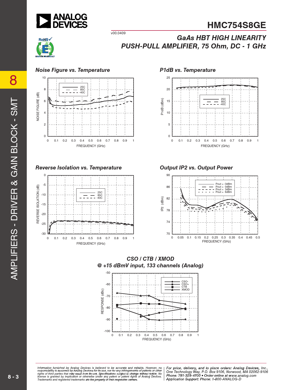 HMC754S8GE v00.0409 GaAs HBT HIGH LINEARITYPUSH-PULL AMPLIFIER, 75 Ohm, DC - 1 GHzNoise Figure vs. TemperatureP1dB vs. Temperature 8 10 25 25C 8 85C 20 ) -40C T (dB E 25C 6 15 85C m R U -40C (dBm) IG s F E 4 10 IS P1dB O N k - 2 5 c 0 0 lo 0 0.1 0.2 0.3 0.4 0.5 0.6 0.7 0.8 0.9 1 0 0.1 0.2 0.3 0.4 0.5 0.6 0.7 0.8 0.9 1 FREQUENCY (GHz) FREQUENCY (GHz) in B A Reverse Isolation vs. TemperatureOutput IP2 vs. Output Power 0 90 ) -5 Pout = -3dBm r & G 86 Pout = 0dBm (dB Pout = 3dBm Pout = 6dBm e N 25C -10 85C IO T -40C ) m 82 iv LA O -15 r IS 2 (dB E S IP 78 R -20 E V E R 74 -25 s - D r -30 70 0 0.1 0.2 0.3 0.4 0.5 0.6 0.7 0.8 0.9 1 0 0.05 0.1 0.15 0.2 0.25 0.3 0.35 0.4 0.45 0.5 ie FREQUENCY (GHz) FREQUENCY (GHz) lif p CSO / CTB / XMOD@ +15 dBmV input, 133 channels (Analog) m A -50 CSO- -60 CSO+ CTB XMOD c) (dB -70 E S N O P -80 S E R -90 -100 0 0.1 0.2 0.3 0.4 0.5 0.6 0.7 0.8 0.9 1 FREQUENCY (GHz) Inf F or o m rat ip o r n ifc ur e n ,is hd e e d lbiv y e Anry alo a g n D d evi cto es ips la beclie ev eo d rtd o e b r e sa: ccH ur iattte itaen M d reliic a r bl o e w . H a o v weev eC r, o n r o For price, delivery, and to place orders: Analog Devices, Inc., responsibility is assumed by Analog Devices for its use, nor for any infringements of patents or other poration, 20 Alpha Road, Chelmsford, MA 01824 One Technology Way, P.O. Box 9106, Norwood, MA 02062-9106 Phone: 978-250-3343 Fax: 978-250-3373 rights of third parties that may result from its use. Specifications subject to change without notice. No Or P d hoe n r e O : 7 n- 81-li 3 n 2 e 9- a 4 t 7 0 www 0 • O . rdh e itt r o it n e li . n co e a m 8 - 3 license is granted by implication or otherwise under any patent or patent rights of Analog Devices. t www.analog.com Application Support: Phon Trademarks and registered trademarks are the property of their respective owners. e: 978-250-334 A 3 p p liocra t ia o pp n S s u @ p h por ittti : Pte. ho c n o e m : 1-800-ANALOG-D
