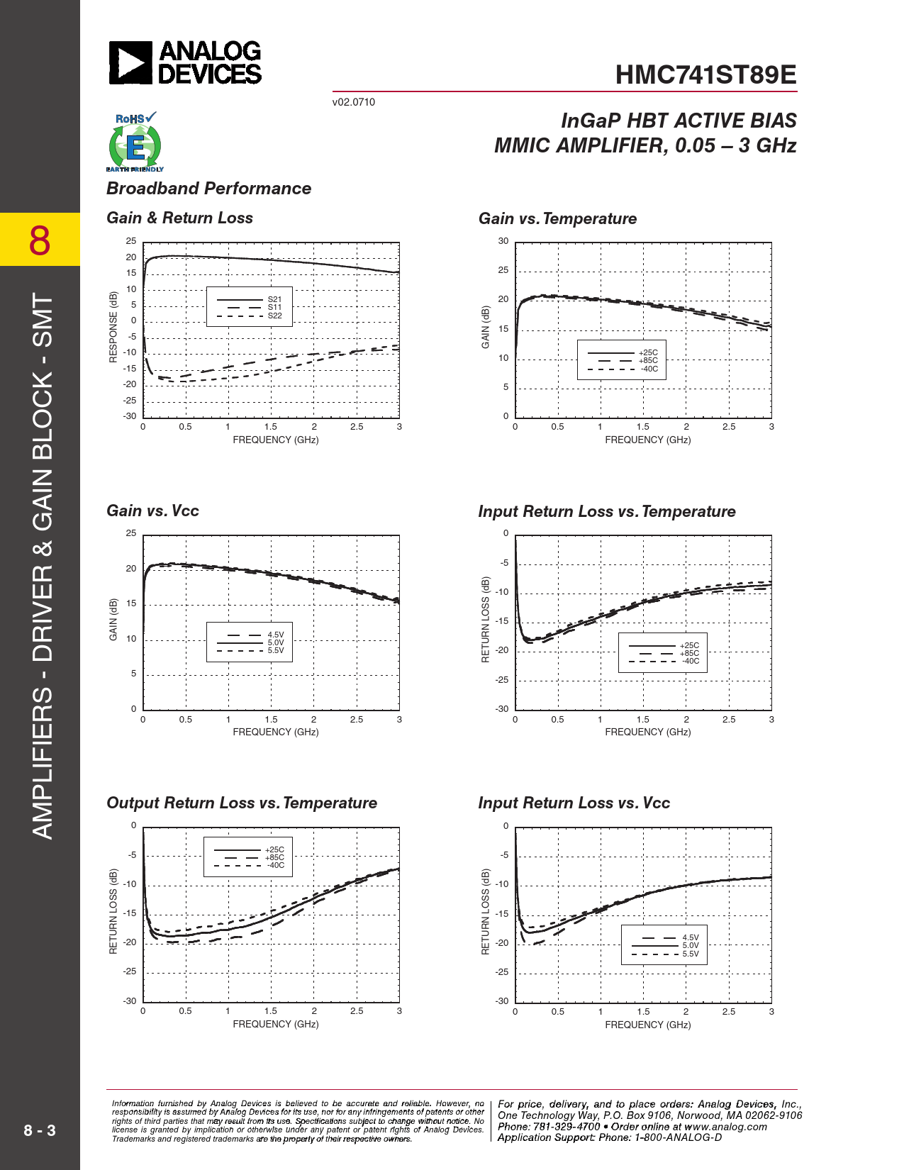 HMC741ST89E. InGaP HBT ACTIVE BIAS. MMIC AMPLIFIER, 0.05 – 3 GHz. Broadband Performance. Gain & Return Loss