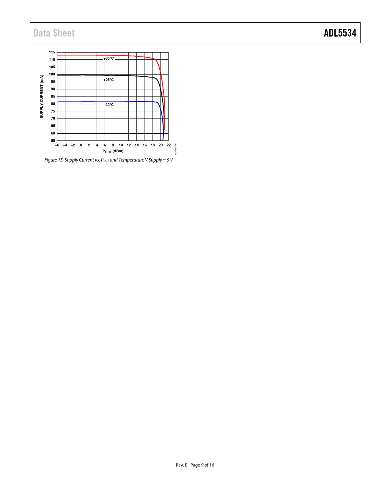Data SheetADL5534115110+85°C105100mA)+25°C95( NT9085CURRE80Y–40°CL P75UP S70656055–6–4–20246810121416182022 100 POUT (dBm) 06836- Figure 15. Supply Current vs. POUT and Temperature V Supply = 5 V Rev. B | Page 9 of 16 Document Outline Features Functional Block Diagram General Description Table of Contents Revision History Specifications Typical Scattering Parameters Absolute Maximum Ratings ESD Caution Pin Configuration and Function Descriptions Typical Performance Characteristics Basic Connections Using Baluns to Combine Both Amplifiers into a Single Amplifier ADC Driving Application Soldering Information and Recommended PCB Land Pattern Evaluation Board Outline Dimensions Ordering Guide
