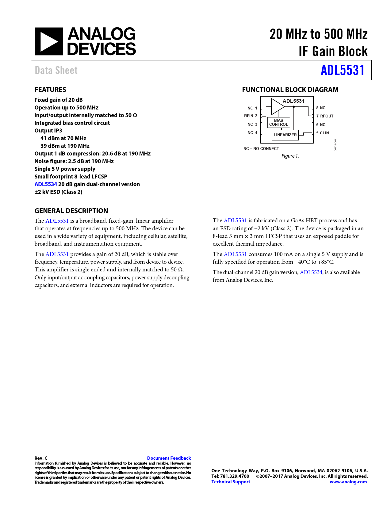 20 MHz to 500 MHz. IF Gain Block. Data Sheet. ADL5531. FEATURES. FUNCTIONAL BLOCK DIAGRAM. Fixed gain of 20 dB