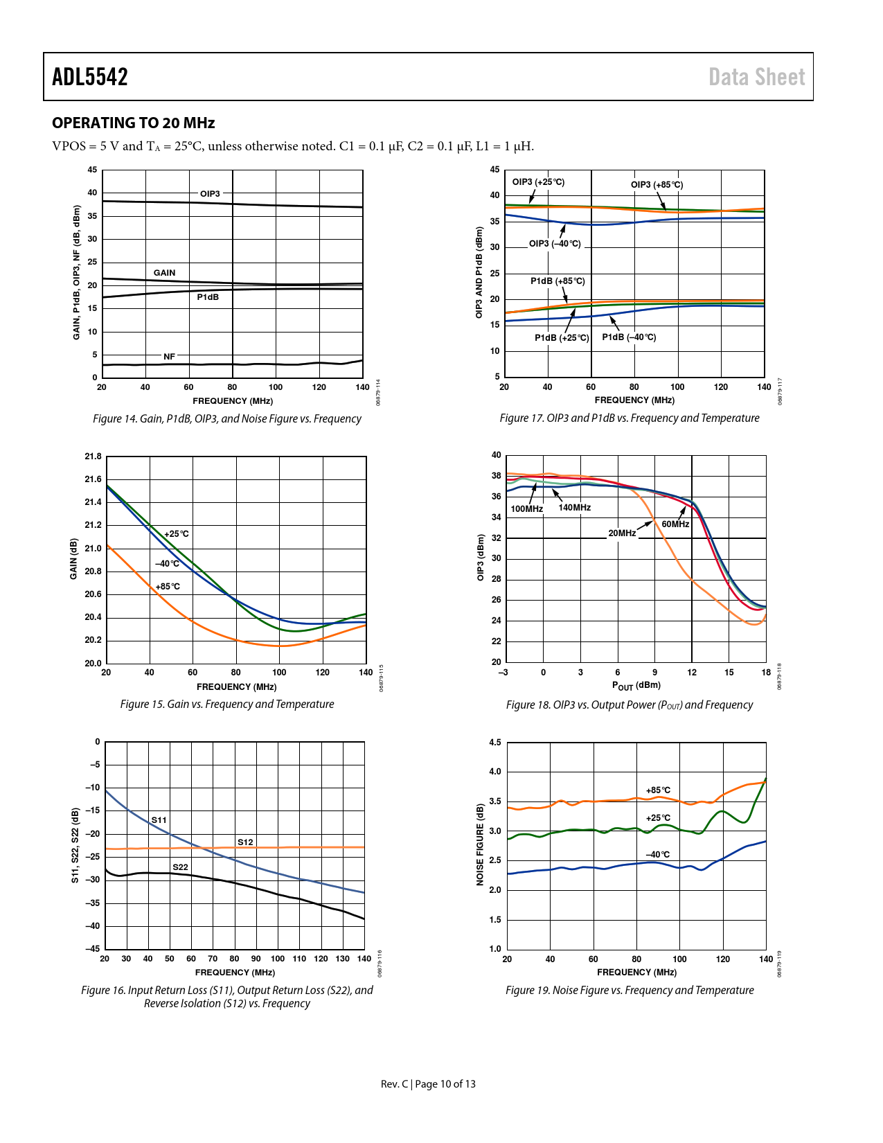 ADL5542. Data Sheet. OPERATING TO 20 MHz. OIP3 (+25°C). OIP3 (+85°C). OIP3. ) m. , dB. Bm) d. OIP3 (–40°C). F (. B (. , N. GAIN. P1dB (+85°C)