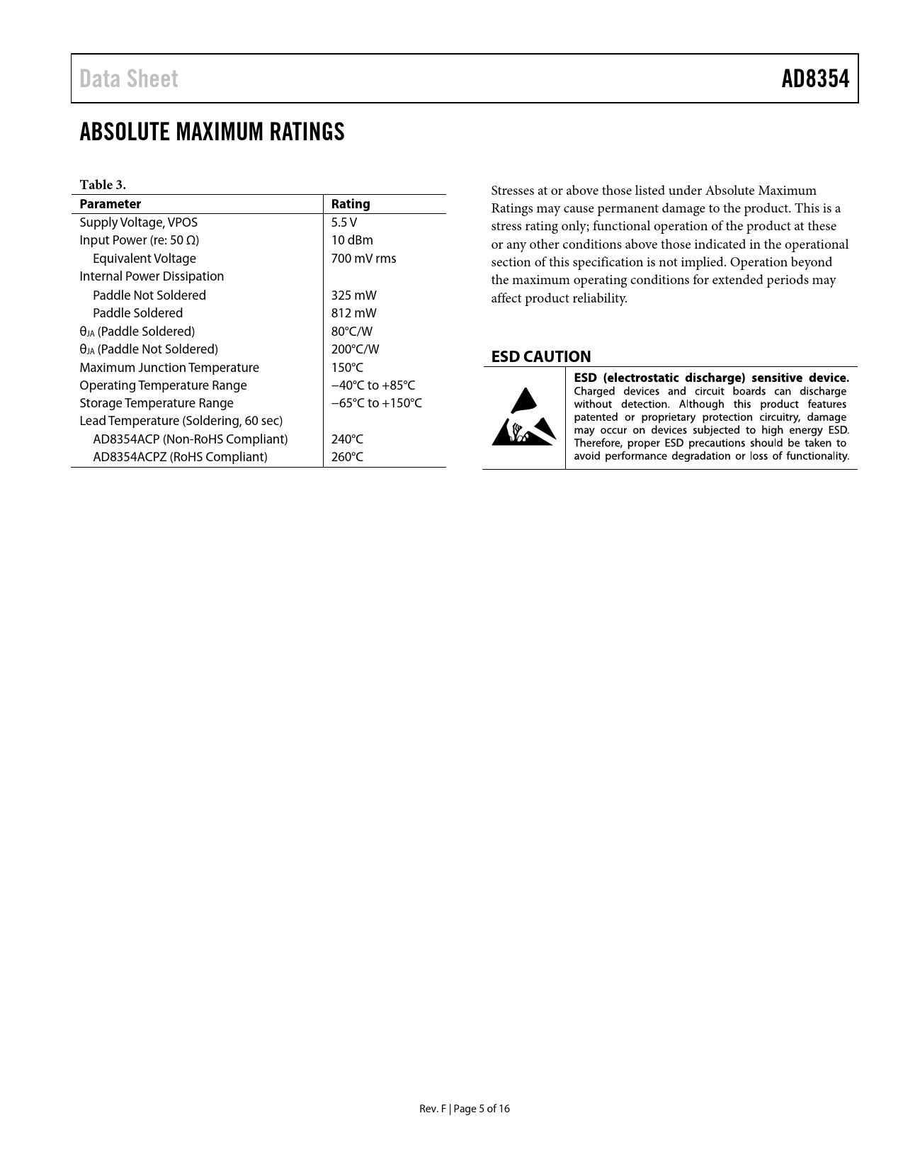 Data Sheet. AD8354. ABSOLUTE MAXIMUM RATINGS. Table 3. Parameter. Rating. ESD CAUTION