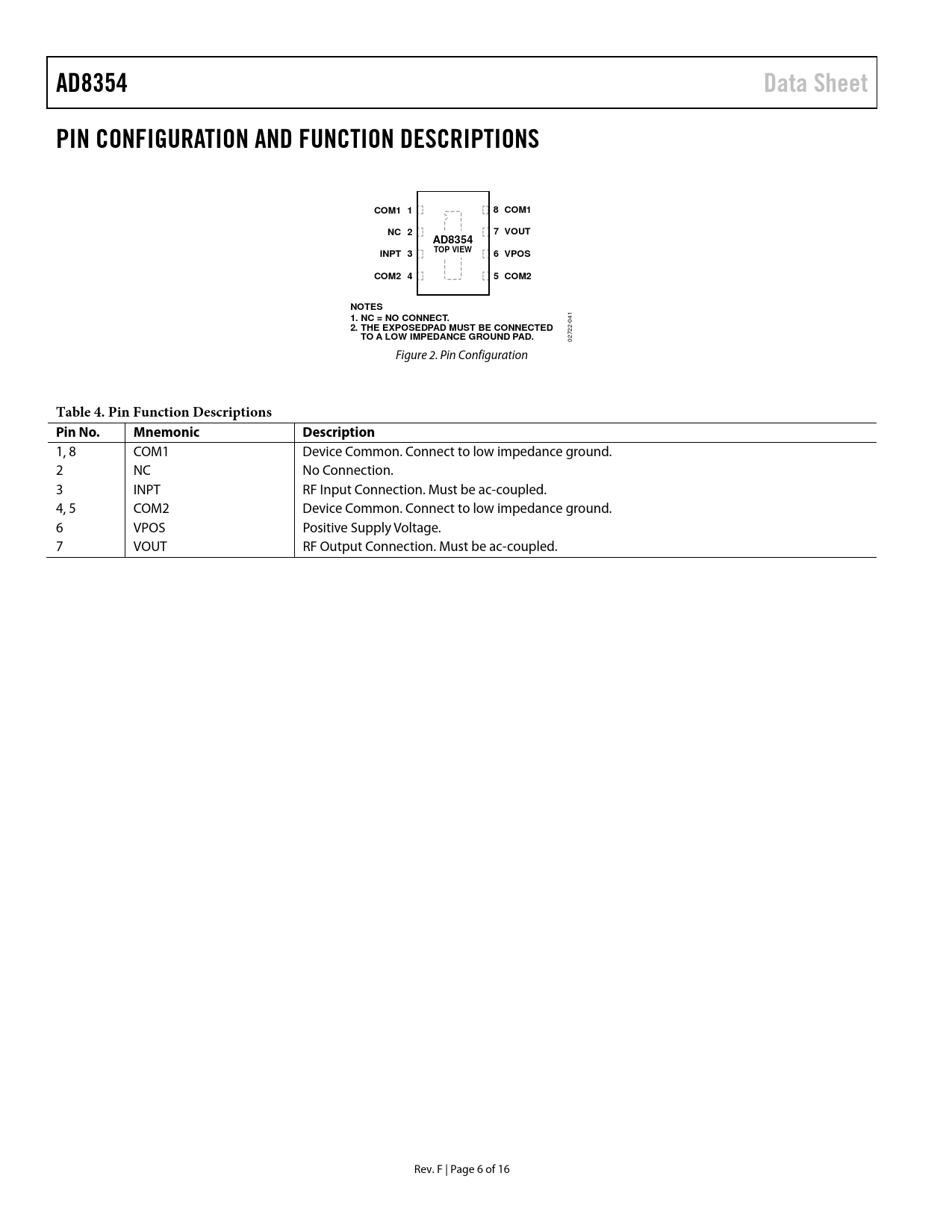 1, 8 COM1 Device Common. Connect to low impedance ground. 2 NC No Connection. 3 INPT RF Input Connection. Must be ac-coupled. 4, 5 COM2 Device Common. Connect to low impedance ground. 6 VPOS Positive Supply Voltage. 7 VOUT RF Output Connection. Must be ac-coupled. Rev. F | Page 6 of 16 Document Outline FEATURES APPLICATIONS FUNCTIONAL BLOCK DIAGRAM GENERAL DESCRIPTION REVISION HISTORY SPECIFICATIONS ABSOLUTE MAXIMUM RATINGS ESD CAUTION PIN CONFIGURATION AND FUNCTION DESCRIPTIONS TYPICAL PERFORMANCE CHARACTERISTICS THEORY OF OPERATION BASIC CONNECTIONS APPLICATIONS INFORMATION LOW FREQUENCY APPLICATIONS BELOW 100 MHz EVALUATION BOARD OUTLINE DIMENSIONS ORDERING GUIDE