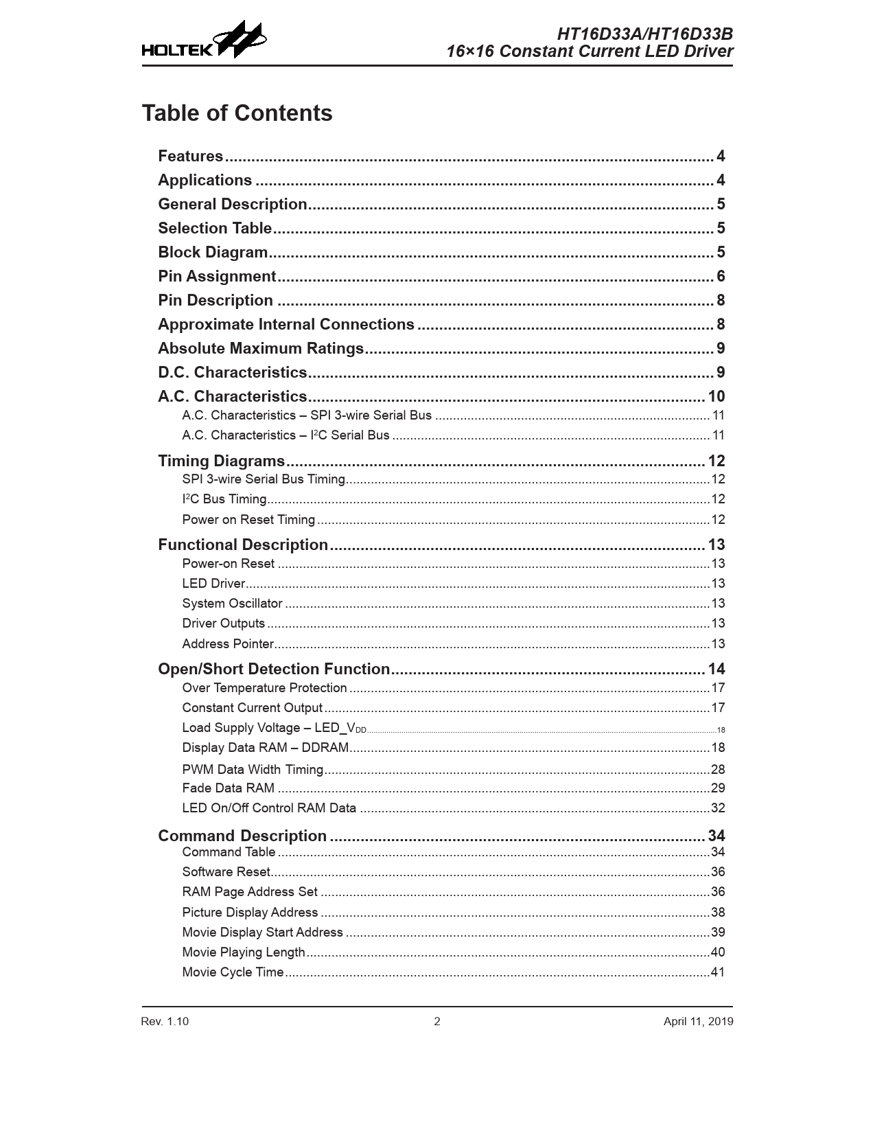 HT16D33A/HT16D33B. 16×16 Constant Current LED Driver. Table of Contents. Features .. 4 Applications ... 4