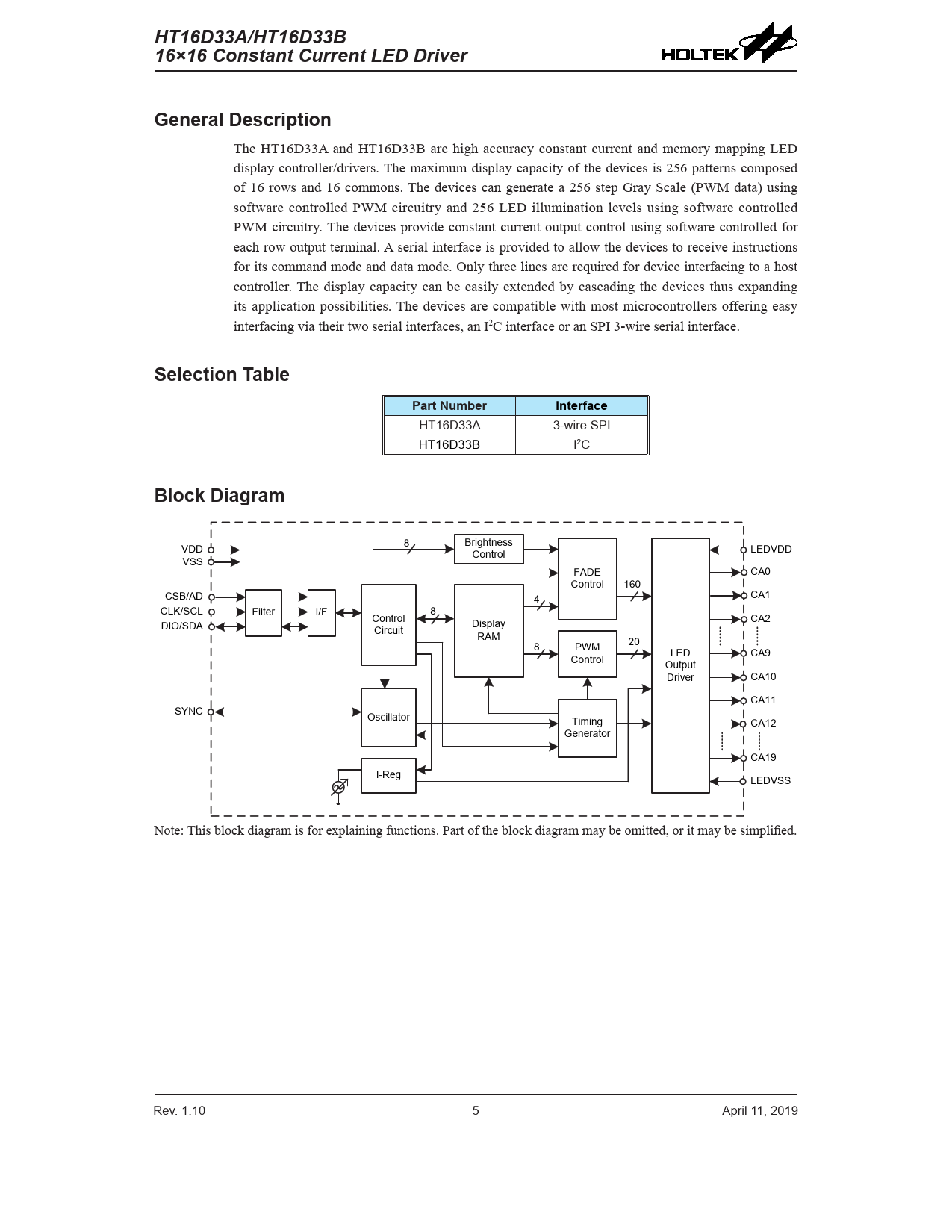 HT16D33A/HT16D33B. 16×16 Constant Current LED Driver. General Description. Selection Table. Part Number. Interface. Block Diagram