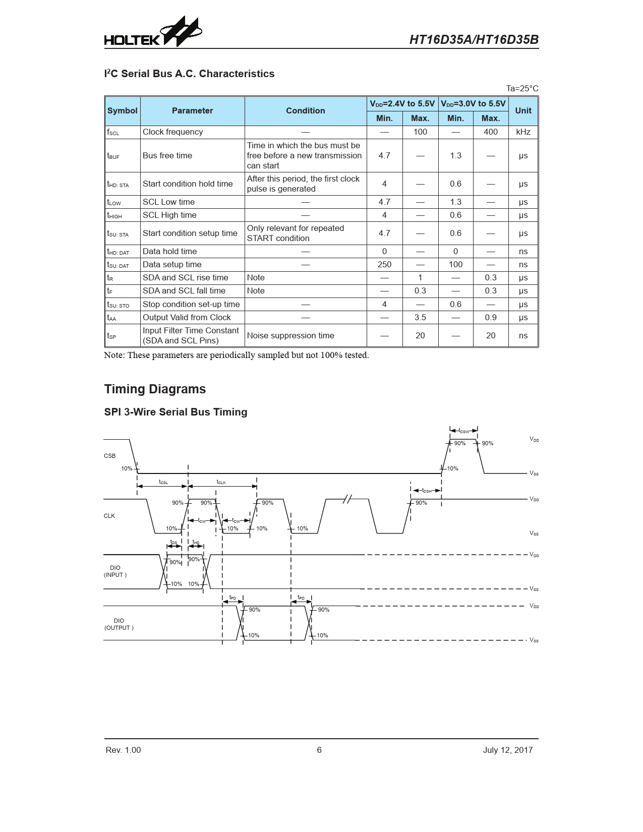 HT16D35A/HT16D35BI2C Serial Bus A.C. Characteristics Ta=25°C VDD=2.4V to 5.5V VDD=3.0V to 5.5VSymbolParameterConditionUnitMin.Max.Min.Max. fSCL Clock frequency — — 100 — 400 kHz Time in which the bus must be tBUF Bus free time free before a new transmission 4.7 — 1.3 — μs can start tHD: STA Start condition hold time After this period, the first clock pulse is generated 4 — 0.6 — μs tLOW SCL Low time — 4.7 — 1.3 — μs tHIGH SCL High time — 4 — 0.6 — μs tSU: STA Start condition setup time Only relevant for repeated START condition 4.7 — 0.6 — μs tHD: DAT Data hold time — 0 — 0 — ns tSU: DAT Data setup time — 250 — 100 — ns tR SDA and SCL rise time Note — 1 — 0.3 μs tF SDA and SCL fall time Note — 0.3 — 0.3 μs tSU: STO Stop condition set-up time — 4 — 0.6 — μs tAA Output Valid from Clock — — 3.5 — 0.9 μs t Input Filter Time Constant SP (SDA and SCL Pins) Noise suppression time — 20 — 20 ns Note: These parameters are periodically sampled but not 100% tested. Timing Diagrams SPI 3-Wire Serial Bus Timing tCSW V 90% 90% DD CSB 10% 10% VSS tCSL tCLK tCSH V 90% 90% 90% 90% DD CLK tCW tCW 10% 10% 10% 10% VSS tDS tHS V 90% DD 90% DIO (INPUT ) 10% 10% VSS tPD tPD V 90% 90% DD DIO (OUTPUT ) 10% 10% VSS Rev. 1.00 6 July 12, 2017 Document Outline Features Applications General Description Selection Table Block Diagram Pin Assignment Pin Description Absolute Maximum Ratings D.C. Characteristics A.C. Characteristics A.C. Characteristics – SPI 3-wire Serial Bus A.C. Characteristics – I2C Serial Bus Timing Diagrams SPI 3-Wire Serial Bus Timing I2C Bus Timing Power on Reset Timing Functional Description Power-on Reset LED Driver System Oscillator ROW Driver Outputs Column Driver Outputs Address Pointer Over Temperature Protection Constant Current Output Setting the Output Current Load Supply Voltage – LED_V Display Data RAM – DDRAM LED Driver Output Waveform Output Signal Timing Fade Data RAM Universal COM (UCOM) RAM Data Universal SEG (USEG) RAM Data Matrix Masking RAM Data Command Description – Command Table Software Reset Binary/Gray Select Number of COM Outputs Global Blinking Cascade Mode System Control Constant Current Ratio Global Brightness Mode Control Scrolling Control Scrolling Speed COM Pin Control ROW Pin Control Direct Pin Control Read Flag Read Status Write Display Data Write Fade Data Write UCOM Data Write USEG Data Write Matrix Masking Data SPI 3-wire Serial Interface I2C Serial Interface Power Supply Sequence Operation Flow Chart Application Circuits LED Matrix Circuit Single LED IC Application Cascade Function Cascade Control Flow Package Information 48-pin LQFP (7mm×7mm) Outline Dimensions (Exposed Pad)