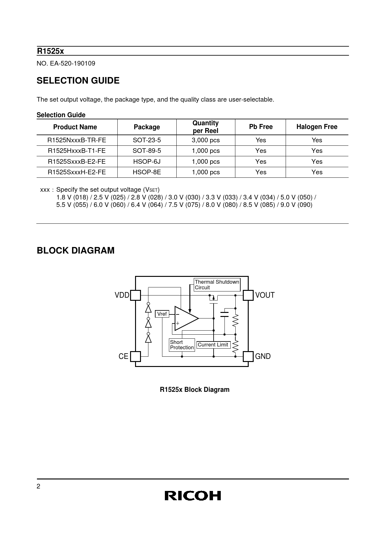 R1525x NO. EA-520-190109 SELECTION GUIDE The set output voltage, the package type, and the quality class are user-selectable. Selection GuideQuantityProduct NamePackagePb FreeHalogen Freeper Reel R1525NxxxB-TR-FE SOT-23-5 3,000 pcs Yes Yes R1525HxxxB-T1-FE SOT-89-5 1,000 pcs Yes Yes R1525SxxxB-E2-FE HSOP-6J 1,000 pcs Yes Yes R1525SxxxH-E2-FE HSOP-8E 1,000 pcs Yes Yes xxx:Specify the set output voltage (VSET) 1.8 V (018) / 2.5 V (025) / 2.8 V (028) / 3.0 V (030) / 3.3 V (033) / 3.4 V (034) / 5.0 V (050) / 5.5 V (055) / 6.0 V (060) / 6.4 V (064) / 7.5 V (075) / 8.0 V (080) / 8.5 V (085) / 9.0 V (090) BLOCK DIAGRAM Thermal Shutdown Circuit VDD VOUT Vref Short Current Limit Protection CE GND R1525x Block Diagram 2
