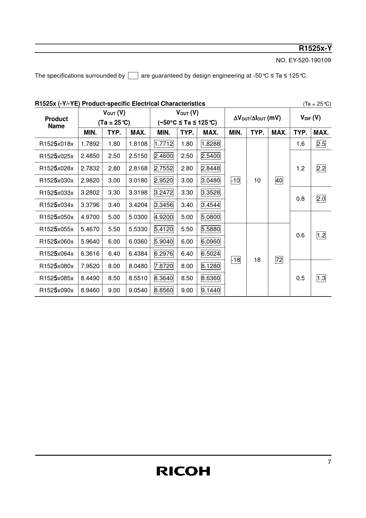 | Páginas / Página | 29 / 7 — R1525x-Y. R1525x (-Y/-YE) Product-specific Electrical Characteristics. … |