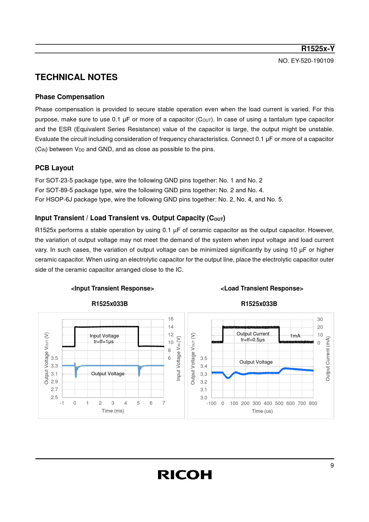 R1525x-Y. TECHNICAL NOTES. Phase Compensation. PCB Layout. Input Transient / Load Transient vs. Output Capacity (COUT)