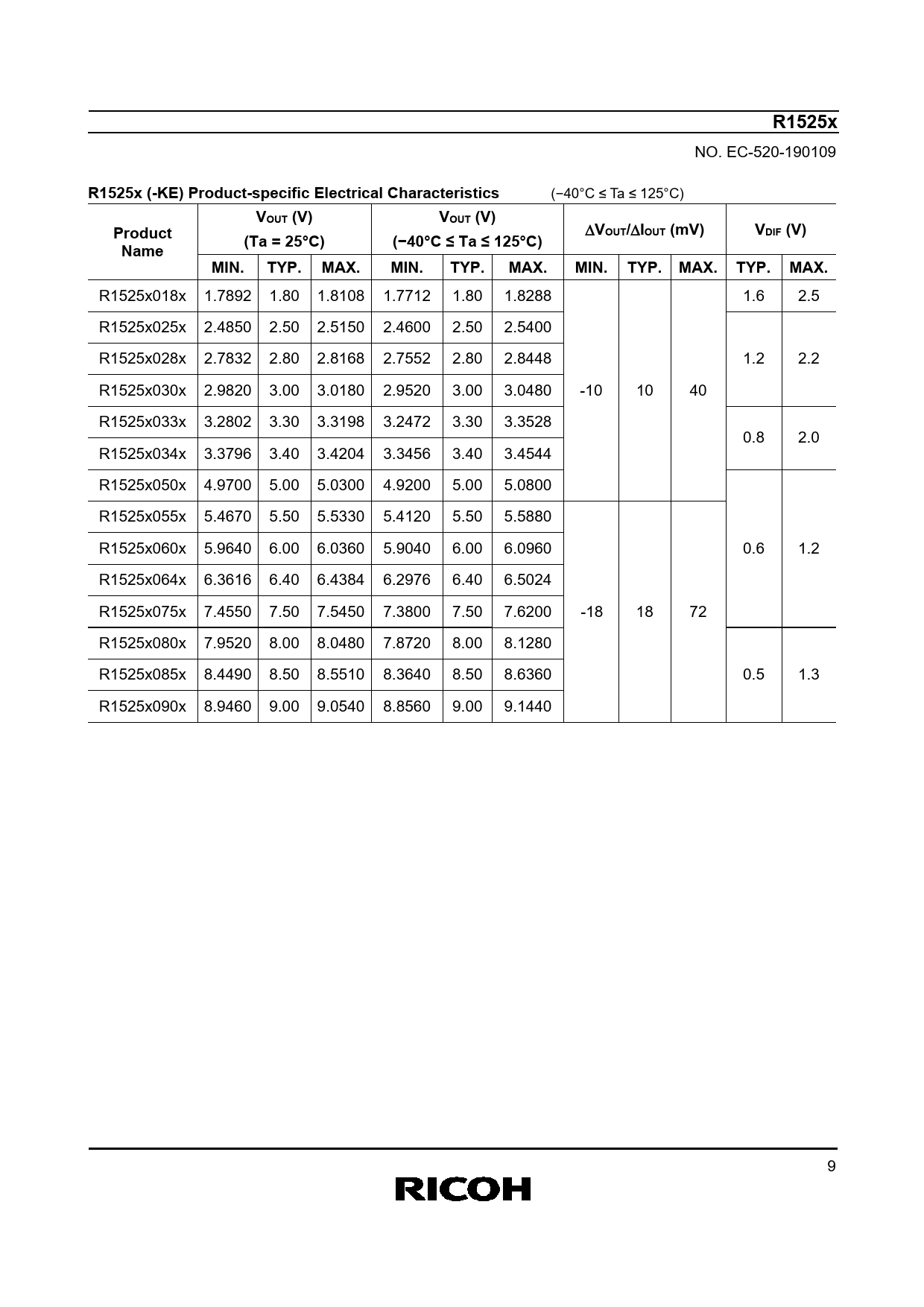 | Páginas / Página | 27 / 9 — R1525x. R1525x (-KE) Product-specific Electrical Characteristics. VOUT … |
