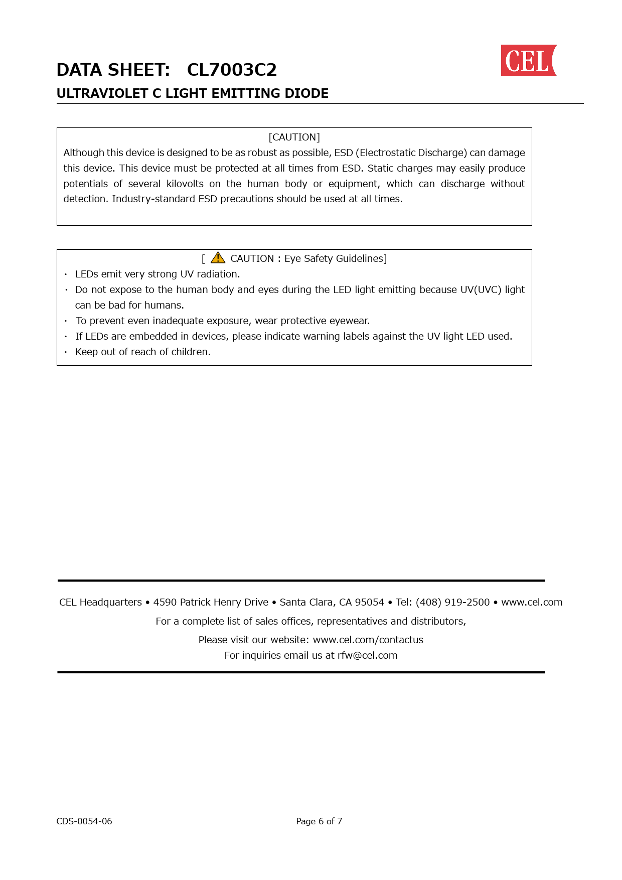 [CAUTION] Although this device is designed to be as robust as possible, ESD (Electrostatic Discharge) can damage this device. This device must be protected at all times from ESD. Static charges may easily produce potentials of several kilovolts on the human body or equipment, which can discharge without detection. Industry-standard ESD precautions should be used at all times. [ CAUTION : Eye Safety Guidelines] ・ LEDs emit very strong UV radiation. ・ Do not expose to the human body and eyes during the LED light emitting because UV(UVC) light can be bad for humans. ・ To prevent even inadequate exposure, wear protective eyewear. ・ If LEDs are embedded in devices, please indicate warning labels against the UV light LED used. ・ Keep out of reach of children. CEL Headquarters • 4590 Patrick Henry Drive • Santa Clara, CA 95054 • Tel: (408) 919-2500 • www.cel.com For a complete list of sales offices, representatives and distributors, Please visit our website: www.cel.com/contactus For inquiries email us at rfw@cel.com CDS-0054-06 Page 6 of 7