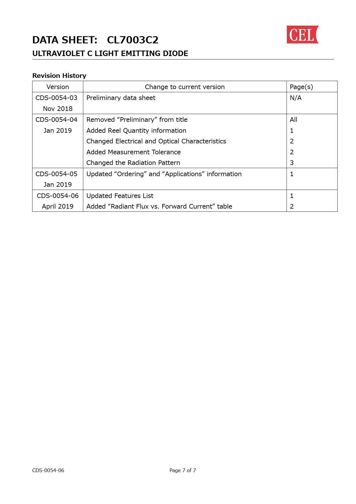 DATA SHEET: CL7003C2 ULTRAVIOLET C LIGHT EMITTING DIODE Revision History