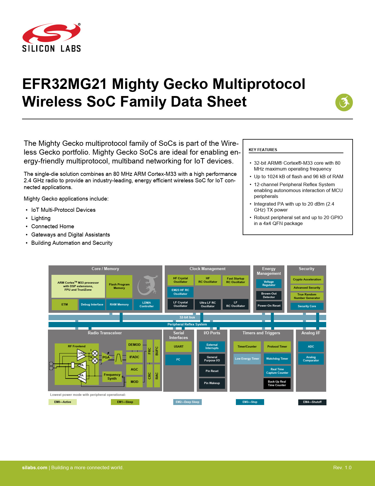 EFR32MG21 Mighty Gecko Multiprotocol Wireless SoC Family Data Sheet The Mighty Gecko multiprotocol family of SoCs is part of the Wire- less Gecko portfolio. Mighty Gecko SoCs are ideal for enabling en- KEY FEATURES ergy-friendly multiprotocol, multiband networking for IoT devices. • 32-bit ARM® Cortex®-M33 core with 80 MHz maximum operating frequency The single-die solution combines an 80 MHz ARM Cortex-M33 with a high performance • Up to 1024 kB of flash and 96 kB of RAM 2.4 GHz radio to provide an industry-leading, energy efficient wireless SoC for IoT con- nected applications. • 12-channel Peripheral Reflex System enabling autonomous interaction of MCU Mighty Gecko applications include: peripherals • Integrated PA with up to 20 dBm (2.4 • IoT Multi-Protocol Devices GHz) TX power • Lighting • Robust peripheral set and up to 20 GPIO in a 4x4 QFN package • Connected Home • Gateways and Digital Assistants • Building Automation and Security Core / MemoryClock ManagementEnergySecurityManagementHF CrystalHFFast StartupCrypto AccelerationOscillatorRC OscillatorRC OscillatorVoltageARM CortexTM M33 processorFlash ProgramRegulatorwith DSP extensions,MemoryAdvanced SecurityFPU and TrustZoneEM23 HF RCOscillatorBrown-OutTrue RandomDetectorNumber GeneratorLDMALF CrystalUltra LF RCLFETMDebug InterfaceRAM MemoryControllerOscillatorOscillatorRC OscillatorPower-On ResetSecurity Core32-bit busPeripheral Reflex SystemRadio TransceiverSerialI/O PortsTimers and TriggersAnalog I/FInterfacesDEMODExternalRF FrontendUSARTTimer/CounterProtocol TimerADCInterruptsILNAFRCBUFCQPGAIFADCGeneralAnalogI2CLow Energy TimerWatchdog TimerPurpose I/OComparatorPAAGCReal TimePin ResetCapture CounterPAFrequencySynthCRCRACMODPin WakeupBack-Up Real Time CounterLowest power mode with peripheral operational:EM0—ActiveEM1—SleepEM2—Deep SleepEM3—StopEM4—Shutoffsilabs.com | Building a more connected world. Rev. 1.0 Document Outline 1. Feature List 2. Ordering Information 3. System Overview 3.1 Introduction 3.2 Radio 3.2.1 Antenna Interface 3.2.2 Fractional-N Frequency Synthesizer 3.2.3 Receiver Architecture 3.2.4 Transmitter Architecture 3.2.5 Packet and State Trace 3.2.6 Data Buffering 3.2.7 Radio Controller (RAC) 3.3 General Purpose Input/Output (GPIO) 3.4 Clocking 3.4.1 Clock Management Unit (CMU) 3.4.2 Internal and External Oscillators 3.5 Counters/Timers and PWM 3.5.1 Timer/Counter (TIMER) 3.5.2 Low Energy Timer (LETIMER) 3.5.3 Real Time Clock with Capture (RTCC) 3.5.4 Back-Up Real Time Counter 3.5.5 Watchdog Timer (WDOG) 3.6 Communications and Other Digital Peripherals 3.6.1 Universal Synchronous/Asynchronous Receiver/Transmitter (USART) 3.6.2 Inter-Integrated Circuit Interface (I2C) 3.6.3 Peripheral Reflex System (PRS) 3.7 Security Features 3.7.1 Standard Security 3.7.2 True Random Number Generator 3.8 Analog 3.8.1 Analog Comparator (ACMP) 3.8.2 Analog to Digital Converter (ADC) 3.9 Reset Management Unit (RMU) 3.10 Core and Memory 3.10.1 Processor Core 3.10.2 Memory System Controller (MSC) 3.10.3 Linked Direct Memory Access Controller (LDMA) 3.11 Memory Map 3.12 Configuration Summary 4. Electrical Specifications 4.1 Electrical Characteristics 4.1.1 Absolute Maximum Ratings 4.1.2 General Operating Conditions 4.1.3 Thermal Characteristics 4.1.4 Current Consumption 4.1.4.1 MCU current consumption at 1.8V 4.1.4.2 MCU current consumption at 3.0V 4.1.4.3 Radio current consumption at 1.8V 4.1.4.4 Radio current consumption at 3.0V 4.1.5 2.4 GHz RF Transceiver Characteristics 4.1.5.1 RF Transmitter Characteristics 4.1.5.2 RF Receiver Characteristics 4.1.6 Flash Characteristics 4.1.7 Wake Up, Entry, and Exit times 4.1.8 Oscillators 4.1.8.1 High Frequency Crystal Oscillator 4.1.8.2 Low Frequency Crystal Oscillator 4.1.8.3 High Frequency RC Oscillator (HFRCO) 4.1.8.4 Fast Start_Up RC Oscillator (FSRCO) 4.1.8.5 Low Frequency RC Oscillator 4.1.8.6 Ultra Low Frequency RC Oscillator 4.1.9 GPIO Pins (3V GPIO pins) 4.1.10 Analog to Digital Converter (ADC) 4.1.11 Analog Comparator (ACMP) 4.1.12 Temperature Sense 4.1.13 Brown Out Detectors 4.1.13.1 DVDD BOD 4.1.13.2 LE DVDD BOD 4.1.13.3 AVDD and VIO BODs 4.1.14 SPI Electrical Specifications 4.1.14.1 SPI Master Timing 4.1.14.2 SPI Slave Timing 4.1.15 I2C Electrical Specifications 4.1.15.1 I2C Standard-mode (Sm) 4.1.15.2 I2C Fast-mode (Fm) 4.1.15.3 I2C Fast-mode Plus (Fm+) 4.2 Typical Performance Curves 4.2.1 Supply Current 4.2.2 2.4 GHz Radio 5. Typical Connection Diagrams 5.1 Power 5.2 RF Matching Networks 5.2.1 2.4 GHz 0 dBm Matching Network 5.2.2 2.4 GHz 10 dBm Matching Network 5.2.3 2.4 GHz 20 dBm Matching Network 5.3 Other Connections 6. Pin Definitions 6.1 QFN32 2.4GHz Device Pinout 6.2 Alternate Function Table 6.3 Analog Peripheral Connectivity 6.4 Digital Peripheral Connectivity 7. QFN32 Package Specifications 7.1 QFN32 Package Dimensions 7.2 QFN32 PCB Land Pattern 7.3 QFN32 Package Marking 8. Revision History