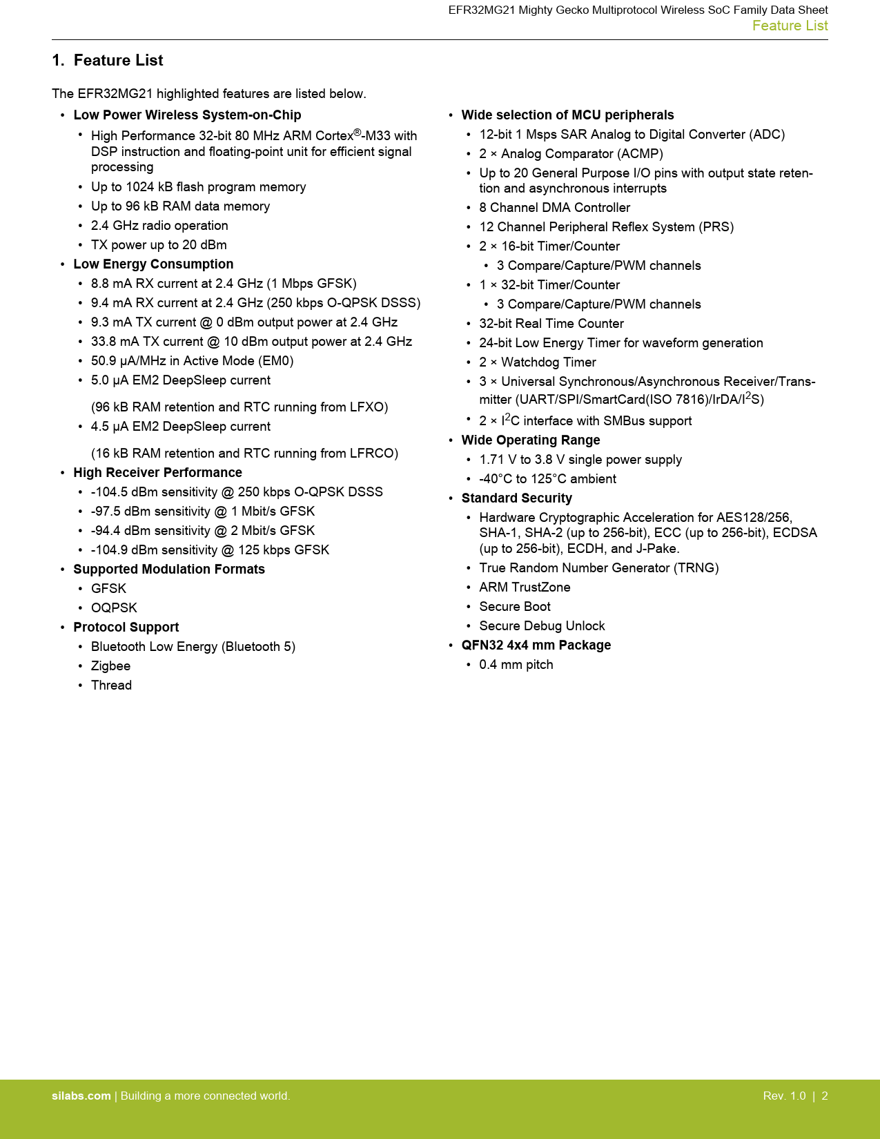 EFR32MG21 Mighty Gecko Multiprotocol Wireless SoC Family Data Sheet Feature List