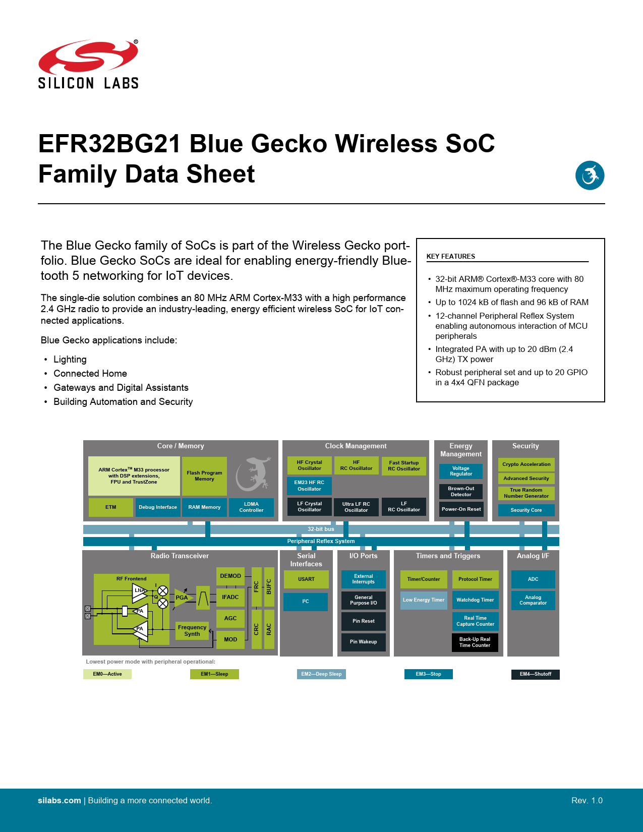 EFR32BG21 Blue Gecko Wireless SoC Family Data Sheet The Blue Gecko family of SoCs is part of the Wireless Gecko port- folio. Blue Gecko SoCs are ideal for enabling energy-friendly Blue- KEY FEATURES tooth 5 networking for IoT devices. • 32-bit ARM® Cortex®-M33 core with 80 MHz maximum operating frequency The single-die solution combines an 80 MHz ARM Cortex-M33 with a high performance • Up to 1024 kB of flash and 96 kB of RAM 2.4 GHz radio to provide an industry-leading, energy efficient wireless SoC for IoT con- nected applications. • 12-channel Peripheral Reflex System enabling autonomous interaction of MCU Blue Gecko applications include: peripherals • Integrated PA with up to 20 dBm (2.4 • Lighting GHz) TX power • Connected Home • Robust peripheral set and up to 20 GPIO in a 4x4 QFN package • Gateways and Digital Assistants • Building Automation and Security Core / MemoryClock ManagementEnergySecurityManagementHF CrystalHFFast StartupCrypto AccelerationOscillatorRC OscillatorRC OscillatorVoltageARM CortexTM M33 processorFlash ProgramRegulatorwith DSP extensions,MemoryAdvanced SecurityFPU and TrustZoneEM23 HF RCOscillatorBrown-OutTrue RandomDetectorNumber GeneratorLDMALF CrystalUltra LF RCLFETMDebug InterfaceRAM MemoryControllerOscillatorOscillatorRC OscillatorPower-On ResetSecurity Core32-bit busPeripheral Reflex SystemRadio TransceiverSerialI/O PortsTimers and TriggersAnalog I/FInterfacesDEMODExternalRF FrontendUSARTTimer/CounterProtocol TimerADCInterruptsILNAFRCBUFCQPGAIFADCGeneralAnalogI2CLow Energy TimerWatchdog TimerPurpose I/OComparatorPAAGCReal TimePin ResetCapture CounterPAFrequencySynthCRCRACMODPin WakeupBack-Up Real Time CounterLowest power mode with peripheral operational:EM0—ActiveEM1—SleepEM2—Deep SleepEM3—StopEM4—Shutoffsilabs.com | Building a more connected world. Rev. 1.0 Document Outline 1. Feature List 2. Ordering Information 3. System Overview 3.1 Introduction 3.2 Radio 3.2.1 Antenna Interface 3.2.2 Fractional-N Frequency Synthesizer 3.2.3 Receiver Architecture 3.2.4 Transmitter Architecture 3.2.5 Packet and State Trace 3.2.6 Data Buffering 3.2.7 Radio Controller (RAC) 3.3 General Purpose Input/Output (GPIO) 3.4 Clocking 3.4.1 Clock Management Unit (CMU) 3.4.2 Internal and External Oscillators 3.5 Counters/Timers and PWM 3.5.1 Timer/Counter (TIMER) 3.5.2 Low Energy Timer (LETIMER) 3.5.3 Real Time Clock with Capture (RTCC) 3.5.4 Back-Up Real Time Counter 3.5.5 Watchdog Timer (WDOG) 3.6 Communications and Other Digital Peripherals 3.6.1 Universal Synchronous/Asynchronous Receiver/Transmitter (USART) 3.6.2 Inter-Integrated Circuit Interface (I2C) 3.6.3 Peripheral Reflex System (PRS) 3.7 Security Features 3.7.1 Standard Security 3.7.2 True Random Number Generator 3.8 Analog 3.8.1 Analog Comparator (ACMP) 3.8.2 Analog to Digital Converter (ADC) 3.9 Reset Management Unit (RMU) 3.10 Core and Memory 3.10.1 Processor Core 3.10.2 Memory System Controller (MSC) 3.10.3 Linked Direct Memory Access Controller (LDMA) 3.11 Memory Map 3.12 Configuration Summary 4. Electrical Specifications 4.1 Electrical Characteristics 4.1.1 Absolute Maximum Ratings 4.1.2 General Operating Conditions 4.1.3 Thermal Characteristics 4.1.4 Current Consumption 4.1.4.1 MCU current consumption at 1.8V 4.1.4.2 MCU current consumption at 3.0V 4.1.4.3 Radio current consumption at 1.8V 4.1.4.4 Radio current consumption at 3.0V 4.1.5 2.4 GHz RF Transceiver Characteristics 4.1.5.1 RF Transmitter Characteristics 4.1.5.2 RF Receiver Characteristics 4.1.6 Flash Characteristics 4.1.7 Wake Up, Entry, and Exit times 4.1.8 Oscillators 4.1.8.1 High Frequency Crystal Oscillator 4.1.8.2 Low Frequency Crystal Oscillator 4.1.8.3 High Frequency RC Oscillator (HFRCO) 4.1.8.4 Fast Start_Up RC Oscillator (FSRCO) 4.1.8.5 Low Frequency RC Oscillator 4.1.8.6 Ultra Low Frequency RC Oscillator 4.1.9 GPIO Pins (3V GPIO pins) 4.1.10 Analog to Digital Converter (ADC) 4.1.11 Analog Comparator (ACMP) 4.1.12 Temperature Sense 4.1.13 Brown Out Detectors 4.1.13.1 DVDD BOD 4.1.13.2 LE DVDD BOD 4.1.13.3 AVDD and VIO BODs 4.1.14 SPI Electrical Specifications 4.1.14.1 SPI Master Timing 4.1.14.2 SPI Slave Timing 4.1.15 I2C Electrical Specifications 4.1.15.1 I2C Standard-mode (Sm) 4.1.15.2 I2C Fast-mode (Fm) 4.1.15.3 I2C Fast-mode Plus (Fm+) 4.2 Typical Performance Curves 4.2.1 Supply Current 4.2.2 2.4 GHz Radio 5. Typical Connection Diagrams 5.1 Power 5.2 RF Matching Networks 5.2.1 2.4 GHz 0 dBm Matching Network 5.2.2 2.4 GHz 10 dBm Matching Network 5.2.3 2.4 GHz 20 dBm Matching Network 5.3 Other Connections 6. Pin Definitions 6.1 QFN32 2.4GHz Device Pinout 6.2 Alternate Function Table 6.3 Analog Peripheral Connectivity 6.4 Digital Peripheral Connectivity 7. QFN32 Package Specifications 7.1 QFN32 Package Dimensions 7.2 QFN32 PCB Land Pattern 7.3 QFN32 Package Marking 8. Revision History
