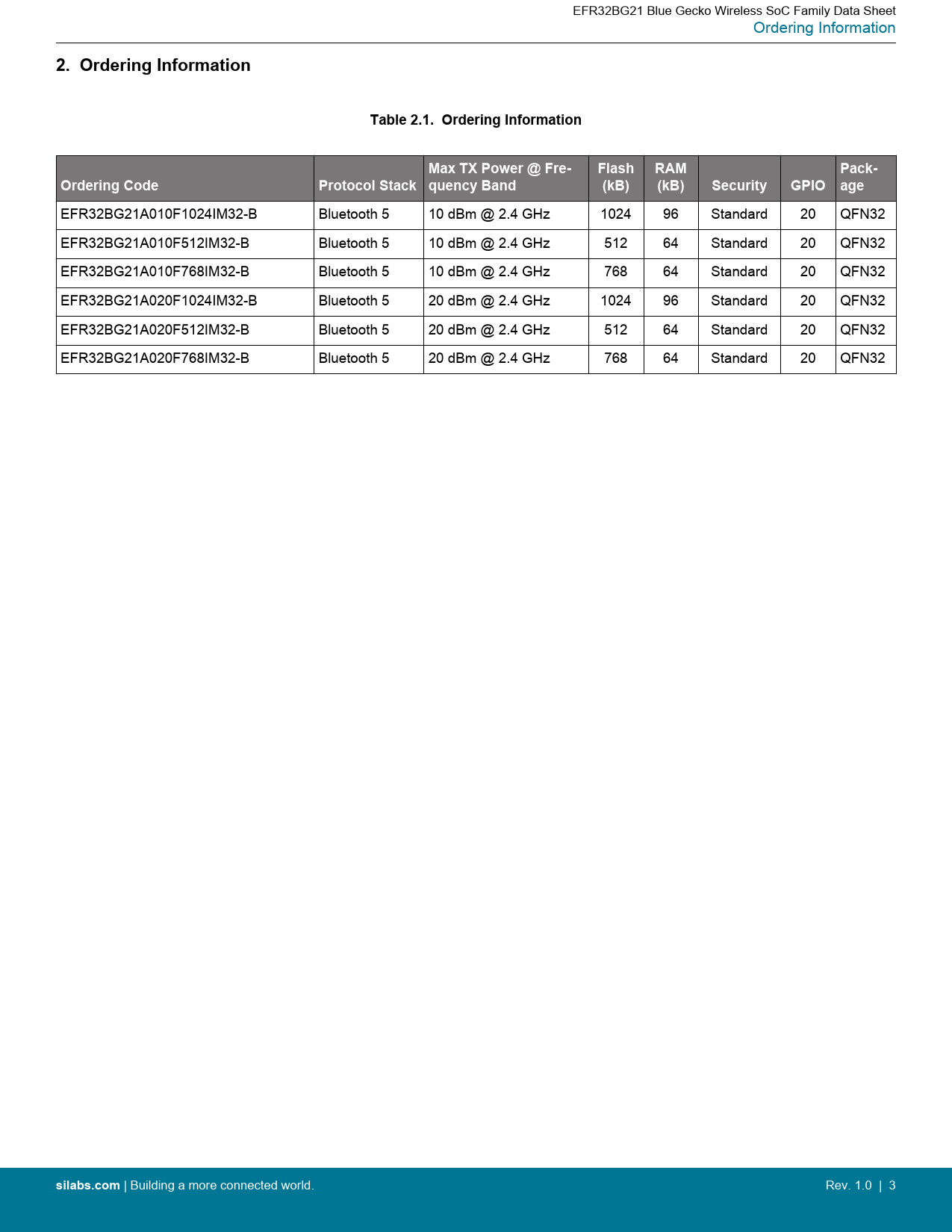 2. Ordering Information. Table 2.1. Ordering Information. Max TX Power @ Fre-. Flash. RAM. Pack-. Ordering Code