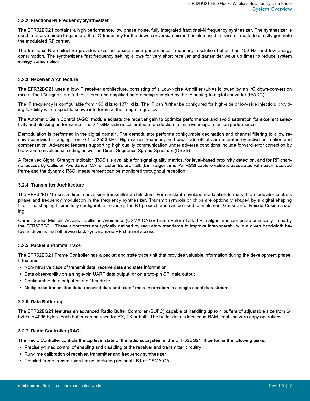 EFR32BG21 Blue Gecko Wireless SoC Family Data Sheet System Overview 3.2.2 Fractional-N Frequency Synthesizer The EFR32BG21 contains a high performance, low phase noise, fully integrated fractional-N frequency synthesizer. The synthesizer is used in receive mode to generate the LO frequency for the down-conversion mixer. It is also used in transmit mode to directly generate the modulated RF carrier. The fractional-N architecture provides excellent phase noise performance, frequency resolution better than 100 Hz, and low energy consumption. The synthesizer’s fast frequency settling allows for very short receiver and transmitter wake up times to reduce system energy consumption. 3.2.3 Receiver Architecture The EFR32BG21 uses a low-IF receiver architecture, consisting of a Low-Noise Amplifier (LNA) followed by an I/Q down-conversion mixer. The I/Q signals are further filtered and amplified before being sampled by the IF analog-to-digital converter (IFADC). The IF frequency is configurable from 150 kHz to 1371 kHz. The IF can further be configured for high-side or low-side injection, provid- ing flexibility with respect to known interferers at the image frequency. The Automatic Gain Control (AGC) module adjusts the receiver gain to optimize performance and avoid saturation for excellent selec- tivity and blocking performance. The 2.4 GHz radio is calibrated at production to improve image rejection performance. Demodulation is performed in the digital domain. The demodulator performs configurable decimation and channel filtering to allow re- ceive bandwidths ranging from 0.1 to 2530 kHz. High carrier frequency and baud rate offsets are tolerated by active estimation and compensation. Advanced features supporting high quality communication under adverse conditions include forward error correction by block and convolutional coding as well as Direct Sequence Spread Spectrum (DSSS). A Received Signal Strength Indicator (RSSI) is available for signal quality metrics, for level-based proximity detection, and for RF chan- nel access by Collision Avoidance (CA) or Listen Before Talk (LBT) algorithms. An RSSI capture value is associated with each received frame and the dynamic RSSI measurement can be monitored throughout reception. 3.2.4 Transmitter Architecture The EFR32BG21 uses a direct-conversion transmitter architecture. For constant envelope modulation formats, the modulator controls phase and frequency modulation in the frequency synthesizer. Transmit symbols or chips are optionally shaped by a digital shaping filter. The shaping filter is fully configurable, including the BT product, and can be used to implement Gaussian or Raised Cosine shap- ing. Carrier Sense Multiple Access - Collision Avoidance (CSMA-CA) or Listen Before Talk (LBT) algorithms can be automatically timed by the EFR32BG21. These algorithms are typically defined by regulatory standards to improve inter-operability in a given bandwidth be- tween devices that otherwise lack synchronized RF channel access. 3.2.5 Packet and State Trace The EFR32BG21 Frame Controller has a packet and state trace unit that provides valuable information during the development phase. It features: • Non-intrusive trace of transmit data, receive data and state information • Data observability on a single-pin UART data output, or on a two-pin SPI data output • Configurable data output bitrate / baudrate • Multiplexed transmitted data, received data and state / meta information in a single serial data stream 3.2.6 Data Buffering The EFR32BG21 features an advanced Radio Buffer Controller (BUFC) capable of handling up to 4 buffers of adjustable size from 64 bytes to 4096 bytes. Each buffer can be used for RX, TX or both. The buffer data is located in RAM, enabling zero-copy operations. 3.2.7 Radio Controller (RAC) The Radio Controller controls the top level state of the radio subsystem in the EFR32BG21. It performs the following tasks: • Precisely-timed control of enabling and disabling of the receiver and transmitter circuitry • Run-time calibration of receiver, transmitter and frequency synthesizer • Detailed frame transmission timing, including optional LBT or CSMA-CA silabs.com | Building a more connected world. Rev. 1.0 | 7 Document Outline 1. Feature List 2. Ordering Information 3. System Overview 3.1 Introduction 3.2 Radio 3.2.1 Antenna Interface 3.2.2 Fractional-N Frequency Synthesizer 3.2.3 Receiver Architecture 3.2.4 Transmitter Architecture 3.2.5 Packet and State Trace 3.2.6 Data Buffering 3.2.7 Radio Controller (RAC) 3.3 General Purpose Input/Output (GPIO) 3.4 Clocking 3.4.1 Clock Management Unit (CMU) 3.4.2 Internal and External Oscillators 3.5 Counters/Timers and PWM 3.5.1 Timer/Counter (TIMER) 3.5.2 Low Energy Timer (LETIMER) 3.5.3 Real Time Clock with Capture (RTCC) 3.5.4 Back-Up Real Time Counter 3.5.5 Watchdog Timer (WDOG) 3.6 Communications and Other Digital Peripherals 3.6.1 Universal Synchronous/Asynchronous Receiver/Transmitter (USART) 3.6.2 Inter-Integrated Circuit Interface (I2C) 3.6.3 Peripheral Reflex System (PRS) 3.7 Security Features 3.7.1 Standard Security 3.7.2 True Random Number Generator 3.8 Analog 3.8.1 Analog Comparator (ACMP) 3.8.2 Analog to Digital Converter (ADC) 3.9 Reset Management Unit (RMU) 3.10 Core and Memory 3.10.1 Processor Core 3.10.2 Memory System Controller (MSC) 3.10.3 Linked Direct Memory Access Controller (LDMA) 3.11 Memory Map 3.12 Configuration Summary 4. Electrical Specifications 4.1 Electrical Characteristics 4.1.1 Absolute Maximum Ratings 4.1.2 General Operating Conditions 4.1.3 Thermal Characteristics 4.1.4 Current Consumption 4.1.4.1 MCU current consumption at 1.8V 4.1.4.2 MCU current consumption at 3.0V 4.1.4.3 Radio current consumption at 1.8V 4.1.4.4 Radio current consumption at 3.0V 4.1.5 2.4 GHz RF Transceiver Characteristics 4.1.5.1 RF Transmitter Characteristics 4.1.5.2 RF Receiver Characteristics 4.1.6 Flash Characteristics 4.1.7 Wake Up, Entry, and Exit times 4.1.8 Oscillator