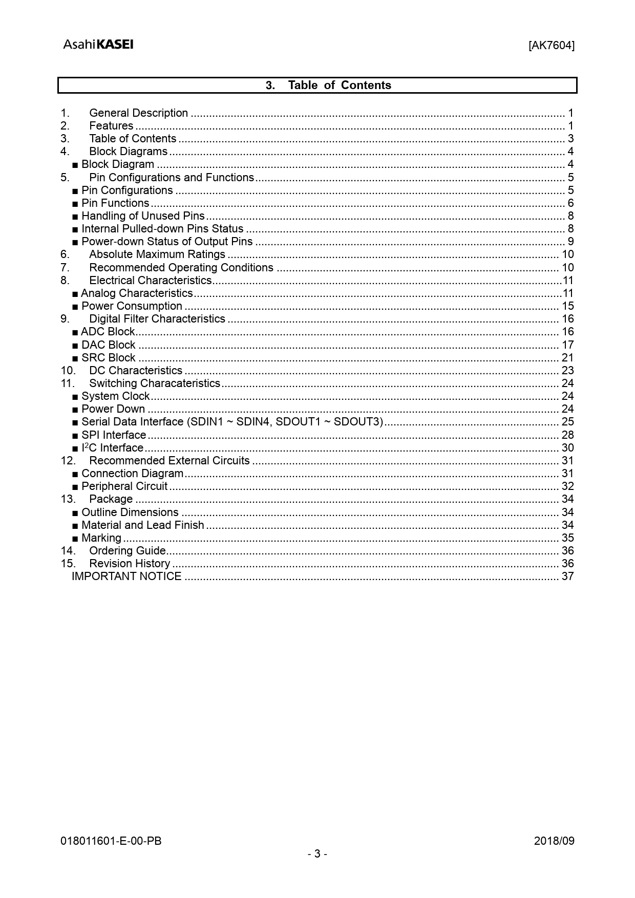 | Páginas / Página | 37 / 3 — [AK7604] 3. Table of Contents 1. 4. General Description . 1. Features . … |