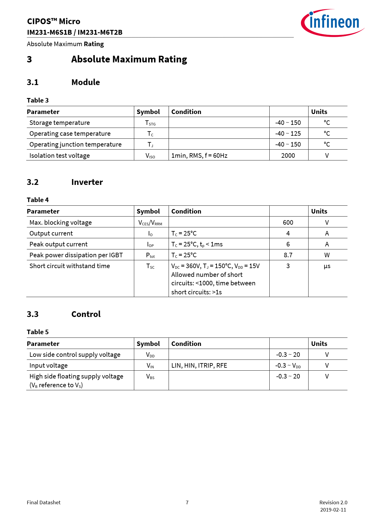 CIPOS™ MicroIM231-M6S1B / IM231-M6T2B Absolute Maximum Rating 3Absolute Maximum Rating3.1ModuleTable 3ParameterSymbolConditionUnits Storage temperature TSTG -40 ~ 150 °C Operating case temperature TC -40 ~ 125 °C Operating junction temperature TJ -40 ~ 150 °C Isolation test voltage VISO 1min, RMS, f = 60Hz 2000 V 3.2InverterTable 4ParameterSymbolConditionUnits Max. blocking voltage VCES/VRRM 600 V Output current IO TC = 25°C 4 A Peak output current IOP TC = 25°C, tp < 1ms 6 A Peak power dissipation per IGBT Ptot TC = 25°C 8.7 W Short circuit withstand time TSC VDC = 360V, TJ = 150°C, VDD = 15V 3 μs Allowed number of short circuits: <1000, time between short circuits: >1s 3.3ControlTable 5ParameterSymbolConditionUnits Low side control supply voltage VDD -0.3 ~ 20 V Input voltage VIN LIN, HIN, ITRIP, RFE -0.3 ~ VDD V High side floating supply voltage VBS -0.3 ~ 20 V (VB reference to VS) Final Datashet 7 Revision 2.0 2019-02-11 Document Outline Description Features Potential Applications Product validation Table 1 Part Ordering Table Table of contents 1 Internal Electrical Schematic 2 Pin Configuration 3 Absolute Maximum Rating 4 Thermal Characteristics 5 Recommended Operating Conditions 6 Static Parameters 7 Dynamic Parameters 8 Thermistor Characteristics 9 Mechanical Characteristics and Ratings 10 Qualification Information 11 Diagrams & Tables 12 Application Guide 13 Package Outline 14 Revision History Disclaimer