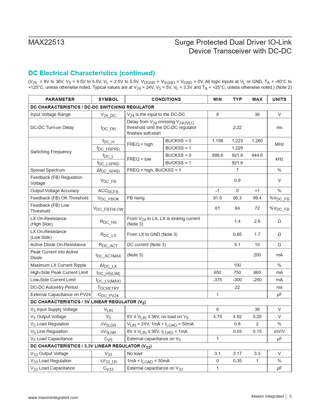 (V24 = 8V to 36V, V5 = 4.5V to 5.5V, VL = 2.5V to 5.5V, VDGND = VSGND = VGND = 0V, All logic inputs at VL or GND, TA = -40°C to +125°C, unless otherwise noted. Typical values are at V24 = 24V, V5 = 5V, VL = 3.3V and TA = +25°C, unless otherwise noted.) (Note 2)