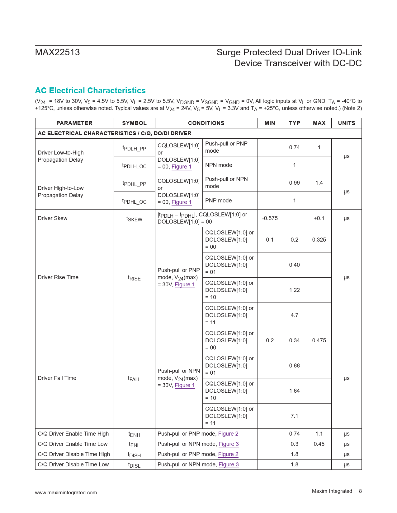 t CQLOSLEW[1:0] Push-pull or PNP PDLH_PP Driver Low-to-High or mode 0.74 1 Propagation Delay DOLOSLEW[1:0] μs tPDLH_OC = 00, Figure 1 NPN mode 1 t CQLOSLEW[1:0] Push-pull or NPN PDHL_PP Driver High-to-Low or mode 0.99 1.4 Propagation Delay DOLOSLEW[1:0] μs tPDHL_OC = 00, Figure 1 PNP mode 1 Driver Skew t |tPDLH – tPDHL|, CQLOSLEW[1:0] or SKEW DOLOSLEW[1:0] = 00 -0.575 +0.1 μs CQLOSLEW[1:0] or DOLOSLEW[1:0] 0.1 0.2 0.325 = 00 CQLOSLEW[1:0] or DOLOSLEW[1:0] 0.40 Push-pull or PNP = 01 Driver Rise Time tRISE mode, V24(max) μs = 30V, Figure 1 CQLOSLEW[1:0] or DOLOSLEW[1:0] 1.22 = 10 CQLOSLEW[1:0] or DOLOSLEW[1:0] 4.7 = 11 CQLOSLEW[1:0] or DOLOSLEW[1:0] 0.2 0.34 0.475 = 00 CQLOSLEW[1:0] or DOLOSLEW[1:0] 0.66 Push-pull or NPN = 01 Driver Fall Time tFALL mode, V24(max) μs = 30V, Figure 1 CQLOSLEW[1:0] or DOLOSLEW[1:0] 1.64 = 10 CQLOSLEW[1:0] or DOLOSLEW[1:0] 7.1 = 11 C/Q Driver Enable Time High tENH Push-pull or PNP mode, Figure 2 0.74 1.1 μs C/Q Driver Enable Time Low tENL Push-pull or NPN mode, Figure 3 0.3 0.45 μs C/Q Driver Disable Time High tDISH Push-pull or PNP mode, Figure 2 1.8 μs C/Q Driver Disable Time Low tDISL Push-pull or NPN mode, Figure 3 1.8 μs www.maximintegrated.com Maxim Integrated │ 8