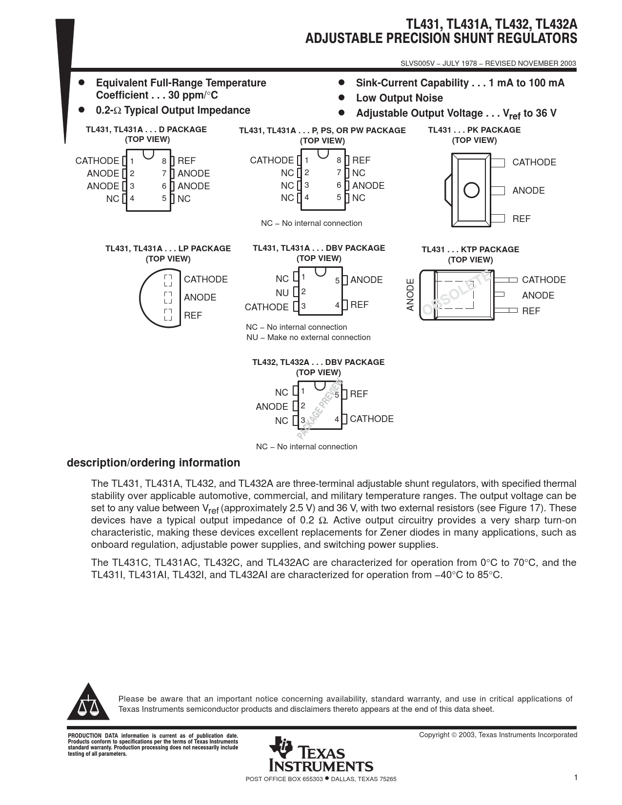 SLVS005V − JULY 1978 − REVISED NOVEMBER 2003 D Equivalent Full-Range Temperature D Sink-Current Capability . 1 mA to 100 mACoefficient . 30 ppm/ ° C D Low Output Noise D 0.2- Ω Typical Output Impedance D Adjustable Output Voltage . Vref to 36 VTL431, TL431A . D PACKAGETL431, TL431A . P, PS, OR PW PACKAGETL431 . PK PACKAGE(TOP VIEW)(TOP VIEW)(TOP VIEW) CATHODE 1 8 REF CATHODE 1 8 REF CATHODE ANODE 2 7 ANODE NC 2 7 NC ANODE 3 6 ANODE NC 3 6 ANODE ANODE NC 4 5 NC NC 4 5 NC REF NC − No internal connection TL431, TL431A . LP PACKAGETL431, TL431A . DBV PACKAGETL431 . KTP PACKAGE(TOP VIEW)(TOP VIEW)(TOP VIEW) CATHODE 1 NC 5 ANODE CATHODE 2 NU ANODE ANODE CATHODE 3 4 REF ANODE REF REF NC − No internal connection NU − Make no external connection TL432, TL432A . DBV PACKAGE(TOP VIEW) 1 NC 5 REF 2 ANODE NC 3 4 CATHODE NC − No internal connection description/ordering information The TL431, TL431A, TL432, and TL432A are three-terminal adjustable shunt regulators, with specified thermal stability over applicable automotive, commercial, and military temperature ranges. The output voltage can be set to any value between Vref (approximately 2.5 V) and 36 V, with two external resistors (see Figure 17). These devices have a typical output impedance of 0.2 Ω. Active output circuitry provides a very sharp turn-on characteristic, making these devices excellent replacements for Zener diodes in many applications, such as onboard regulation, adjustable power supplies, and switching power supplies. The TL431C, TL431AC, TL432C, and TL432AC are characterized for operation from 0°C to 70°C, and the TL431I, TL431AI, TL432I, and TL432AI are characterized for operation from −40°C to 85°C. Please be aware that an important notice concerning availability, standard warranty, and use in critical applications of Texas Instruments semiconductor products and disclaimers thereto appears at the end of this data sheet. !"# $"%&! '#( Copyright 2003, Texas Instruments Incorporated '"! $#!! $# )# # #* "# '' +,( '"! $!#- '# #!#&, !&"'# #- && $##( POST OFFICE BOX 655303 • DALLAS, TEXAS 75265 1