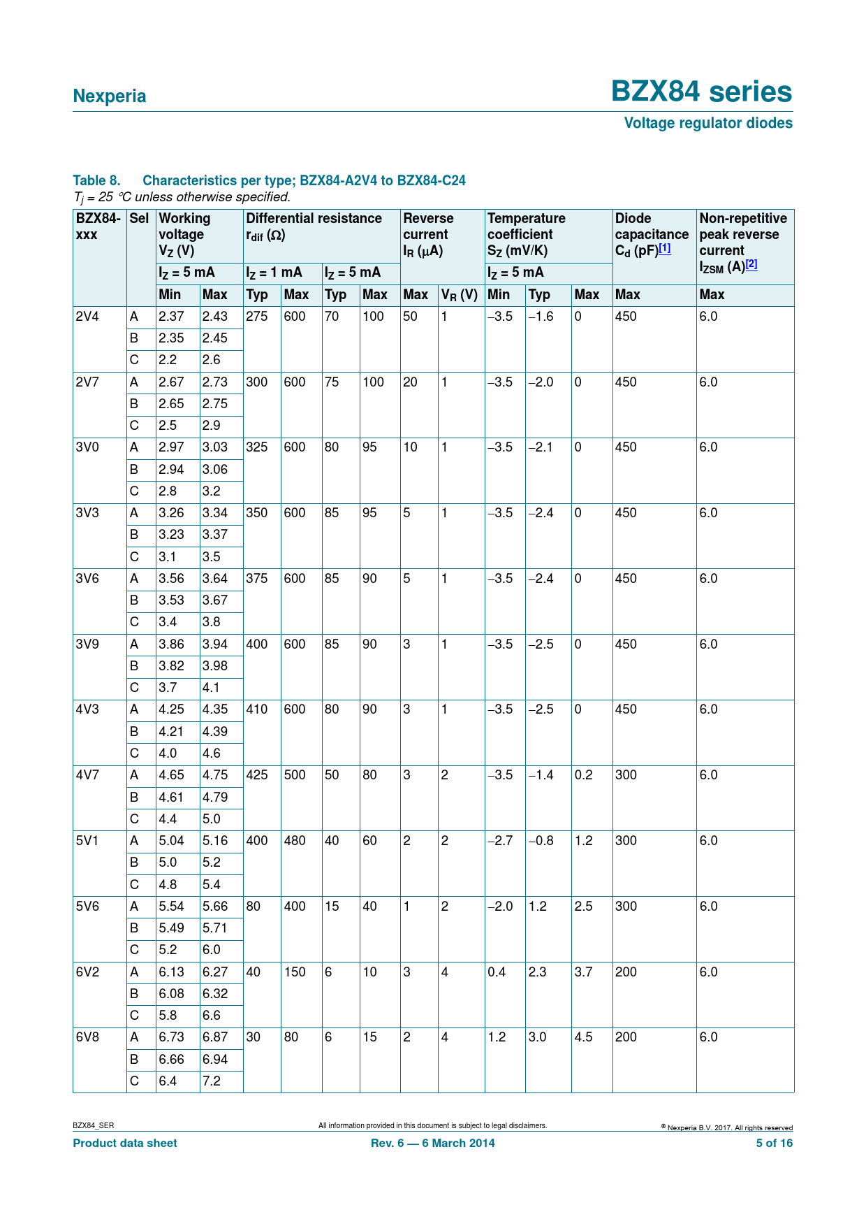 2V4 A 2.37 2.43 275 600 70 100 50 1 3.5 1.6 0 450 6.0 B 2.35 2.45 C 2.2 2.6 2V7 A 2.67 2.73 300 600 75 100 20 1 3.5 2.0 0 450 6.0 B 2.65 2.75 C 2.5 2.9 3V0 A 2.97 3.03 325 600 80 95 10 1 3.5 2.1 0 450 6.0 B 2.94 3.06 C 2.8 3.2 3V3 A 3.26 3.34 350 600 85 95 5 1 3.5 2.4 0 450 6.0 B 3.23 3.37 C 3.1 3.5 3V6 A 3.56 3.64 375 600 85 90 5 1 3.5 2.4 0 450 6.0 B 3.53 3.67 C 3.4 3.8 3V9 A 3.86 3.94 400 600 85 90 3 1 3.5 2.5 0 450 6.0 B 3.82 3.98 C 3.7 4.1 4V3 A 4.25 4.35 410 600 80 90 3 1 3.5 2.5 0 450 6.0 B 4.21 4.39 C 4.0 4.6 4V7 A 4.65 4.75 425 500 50 80 3 2 3.5 1.4 0.2 300 6.0 B 4.61 4.79 C 4.4 5.0 5V1 A 5.04 5.16 400 480 40 60 2 2 2.7 0.8 1.2 300 6.0 B 5.0 5.2 C 4.8 5.4 5V6 A 5.54 5.66 80 400 15 40 1 2 2.0 1.2 2.5 300 6.0 B 5.49 5.71 C 5.2 6.0 6V2 A 6.13 6.27 40 150 6 10 3 4 0.4 2.3 3.7 200 6.0 B 6.08 6.32 C 5.8 6.6 6V8 A 6.73 6.87 30 80 6 15 2 4 1.2 3.0 4.5 200 6.0 B 6.66 6.94 C 6.4 7.2 BZX84_SER All information provided in this document is subject to legal disclaimers. © Nexperia B.V. 2017. All rights reserved