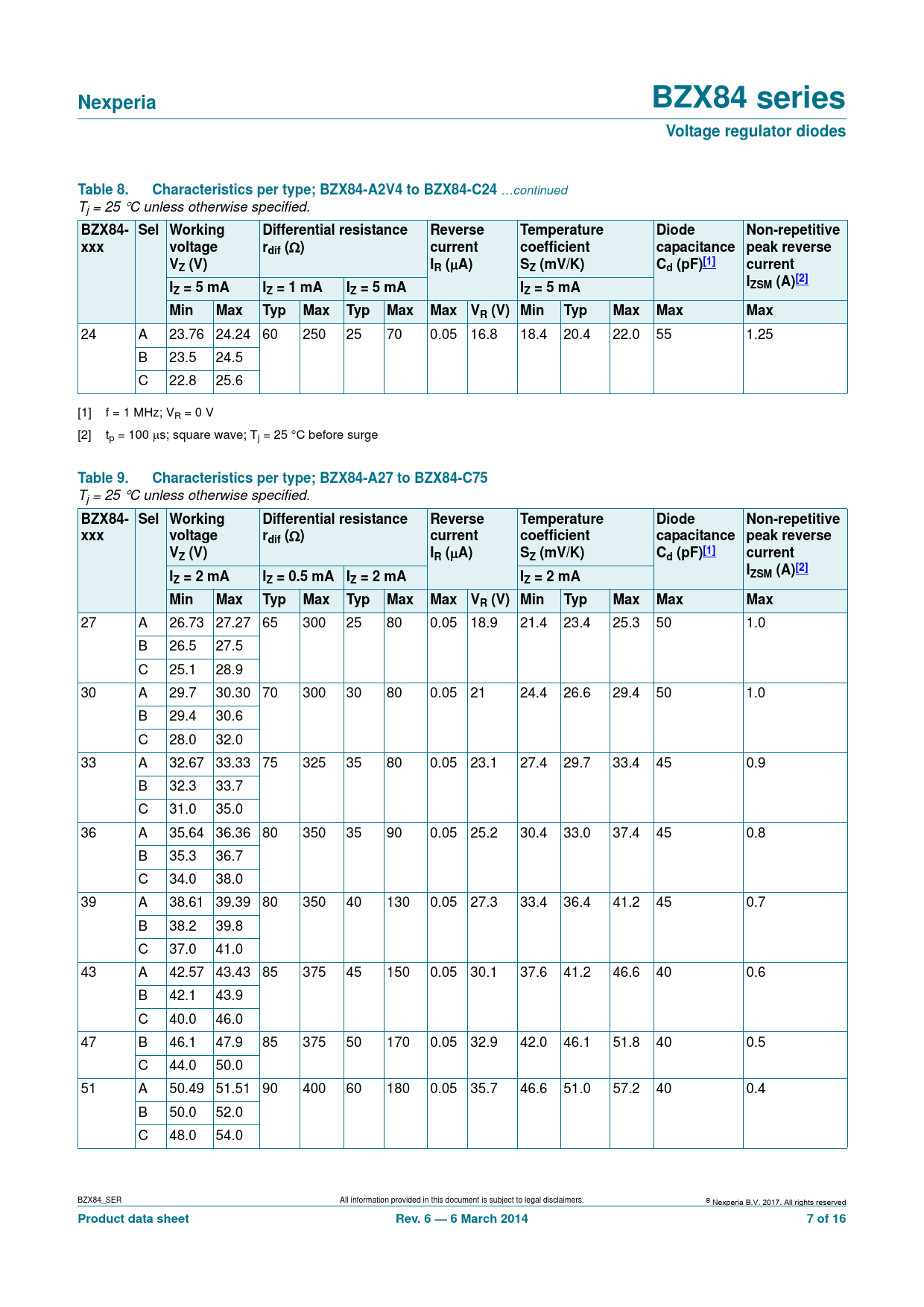 Nexperia BZX84 series Voltage regulator diodes Table 8. Characteristics per type; BZX84-A2V4 to BZX84-C24