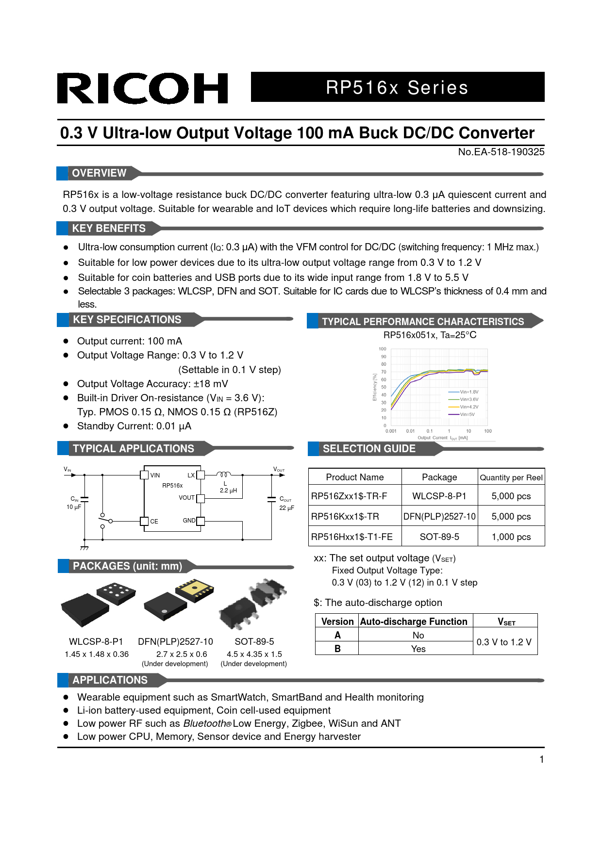 RP516x Series0.3 V Ultra-low Output Voltage 100 mA Buck DC/DC Converter No.EA-518-190325 OVERVIEW RP516x is a low-voltage resistance buck DC/DC converter featuring ultra-low 0.3 μA quiescent current and 0.3 V output voltage. Suitable for wearable and IoT devices which require long-life batteries and downsizing. KEY BENEFITS ● Ultra-low consumption current (IQ: 0.3 μA) with the VFM control for DC/DC (switching frequency: 1 MHz max.) ● Suitable for low power devices due to its ultra-low output voltage range from 0.3 V to 1.2 V ● Suitable for coin batteries and USB ports due to its wide input range from 1.8 V to 5.5 V ● Selectable 3 packages: WLCSP, DFN and SOT. Suitable for IC cards due to WLCSP’s thickness of 0.4 mm and less. KEY SPECIFICATIONSTYPICAL PERFORMANCE CHARACTERISTICS • RP516x051x, Ta=25°C Output current: 100 mA • Output Voltage Range: 0.3 V to 1.2 V (Settable in 0.1 V step) • Output Voltage Accuracy: ±18 mV • Built-in Driver On-resistance (VIN = 3.6 V): Typ. PMOS 0.15 Ω, NMOS 0.15 Ω (RP516Z) • Standby Current: 0.01 µA TYPICAL APPLICATIONSSELECTION GUIDE VIN VOUT VIN LX Product Name Package Quantity per Reel L RP516x 2.2 µH C VOUT RP516Zxx1$-TR-F WLCSP-8-P1 5,000 pcs IN COUT 10 µF 22 µF RP516Kxx1$-TR DFN(PLP)2527-10 5,000 pcs CE GND RP516Hxx1$-T1-FE SOT-89-5 1,000 pcs xx: The set output voltage (VSET) PACKAGES (unit: mm) Fixed Output Voltage Type: 0.3 V (03) to 1.2 V (12) in 0.1 V step $: The auto-discharge option Version Auto-discharge FunctionVSETA No WLCSP-8-P1 DFN(PLP)2527-10 SOT-89-5 0.3 V to 1.2 V B Yes 1.45 x 1.48 x 0.36 2.7 x 2.5 x 0.6 4.5 x 4.35 x 1.5 (Under development) (Under development) APPLICATIONS • Wearable equipment such as SmartWatch, SmartBand and Health monitoring • Li-ion battery-used equipment, Coin cell-used equipment • Low power RF such as Bluetooth® Low Energy, Zigbee, WiSun and ANT • Low power CPU, Memory, Sensor device and Energy harvester 1