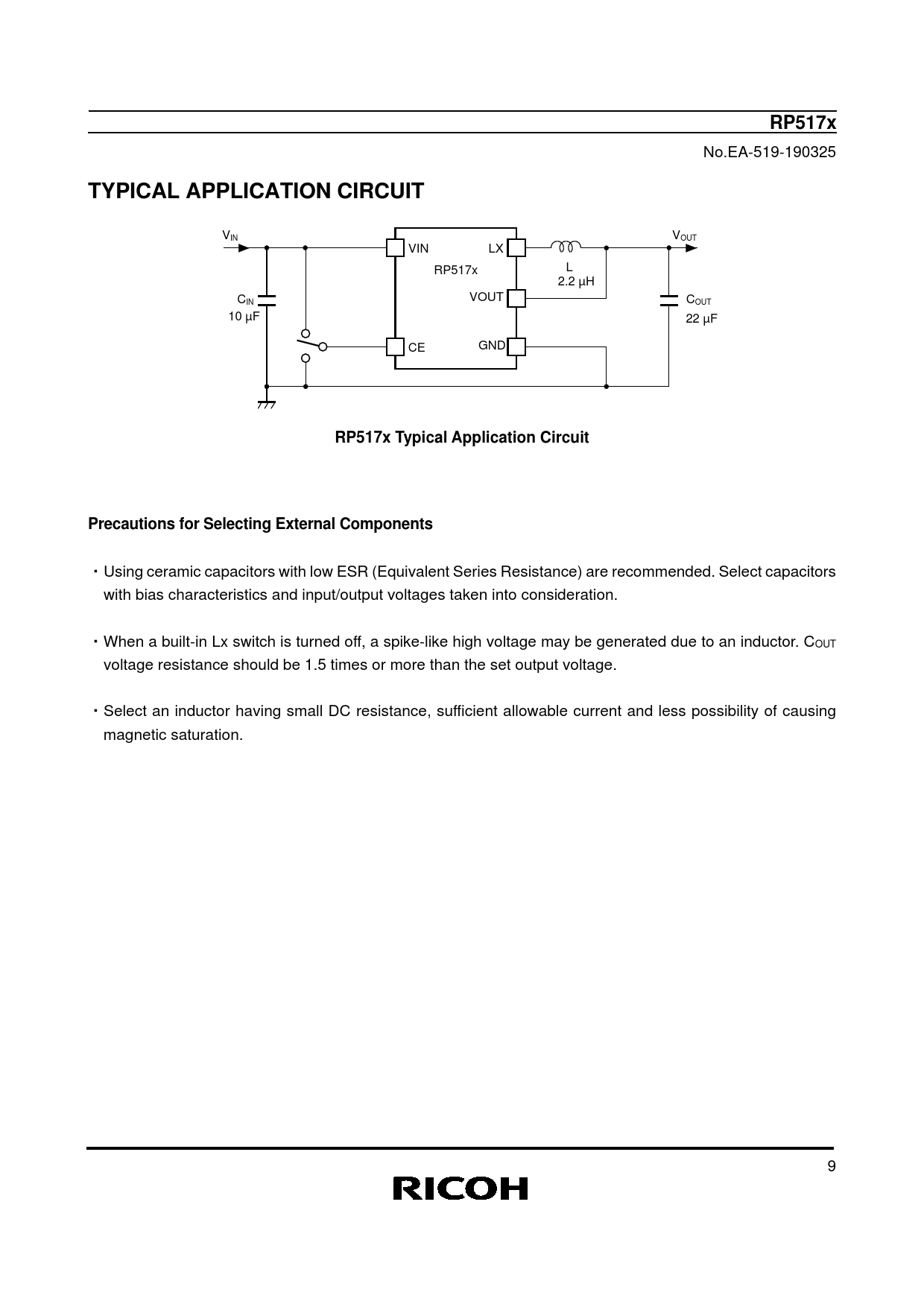RP517x No.EA-519-190325 TYPICAL APPLICATION CIRCUIT VIN VOUT VIN LX L RP517x 2.2 µH C VOUT IN COUT 10 µF 22 µF CE GND RP517x Typical Application CircuitPrecautions for Selecting External Components ・Using ceramic capacitors with low ESR (Equivalent Series Resistance) are recommended. Select capacitors with bias characteristics and input/output voltages taken into consideration. ・When a built-in Lx switch is turned off, a spike-like high voltage may be generated due to an inductor. COUT voltage resistance should be 1.5 times or more than the set output voltage. ・Select an inductor having small DC resistance, sufficient allowable current and less possibility of causing magnetic saturation. 9