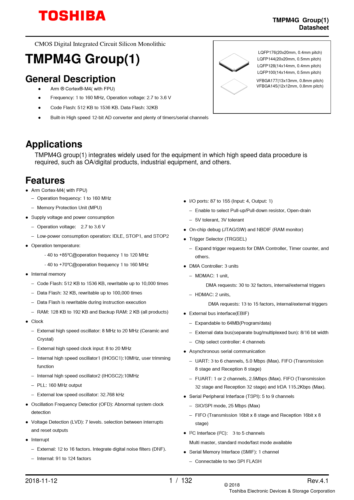 | Páginas / Página | 132 / 1 — TMPM4G Group(1). Datasheet. General Description. Applications. Features |