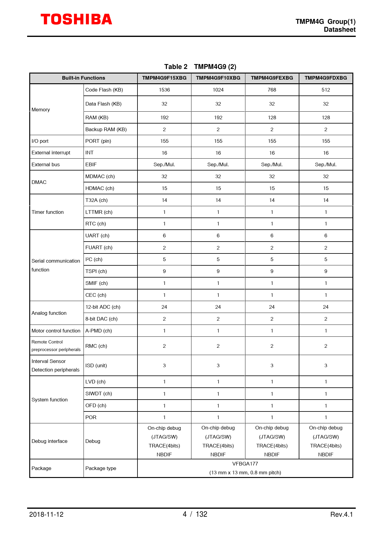 TMPM4G Group(1). Datasheet. Table 2 TMPM4G9 (2). Built-in Functions. TMPM4G9F15XBG. TMPM4G9F10XBG. TMPM4G9FEXBG. TMPM4G9FDXBG