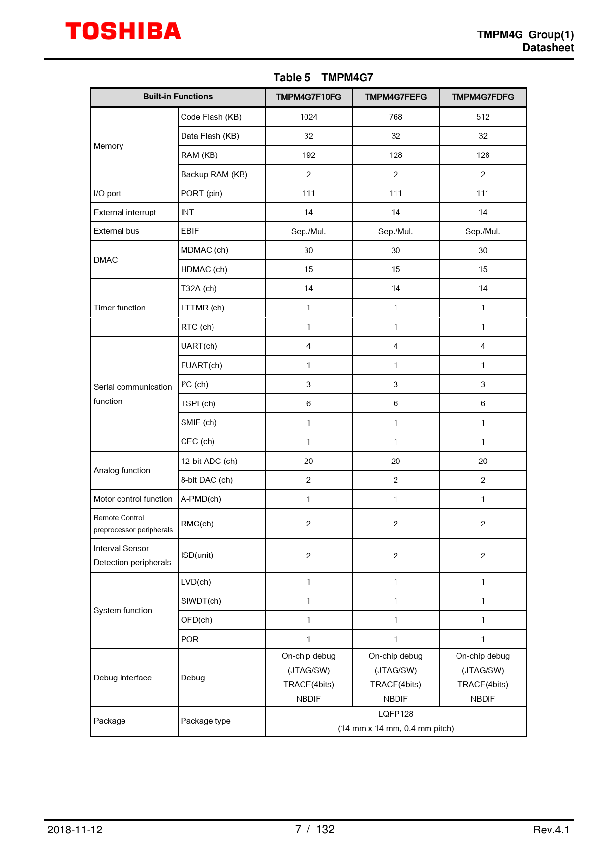 TMPM4G Group(1). Datasheet. Table 5 TMPM4G7. Built-in Functions