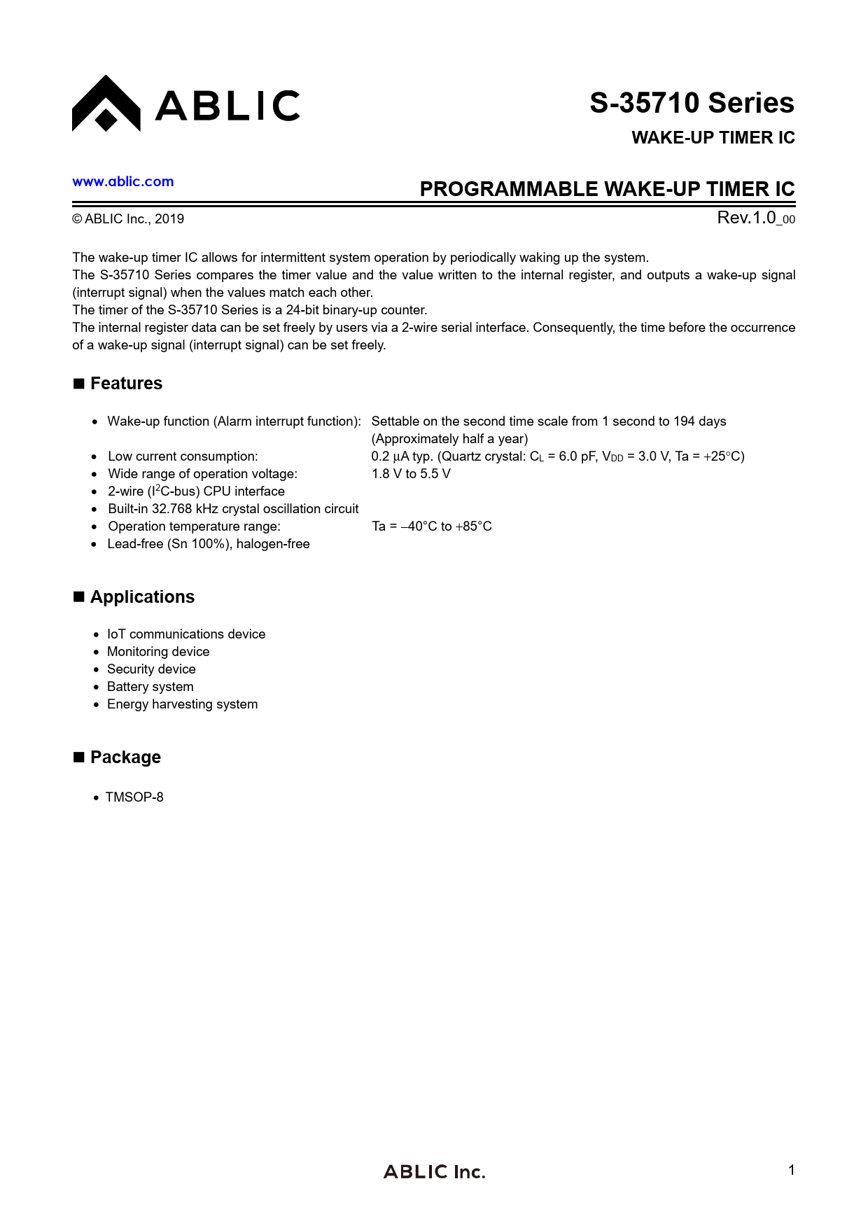 S-35710 Series. WAKE-UP TIMER IC. www.ablic.com. PROGRAMMABLE WAKE-UP TIMER IC. Features. Applications. Package