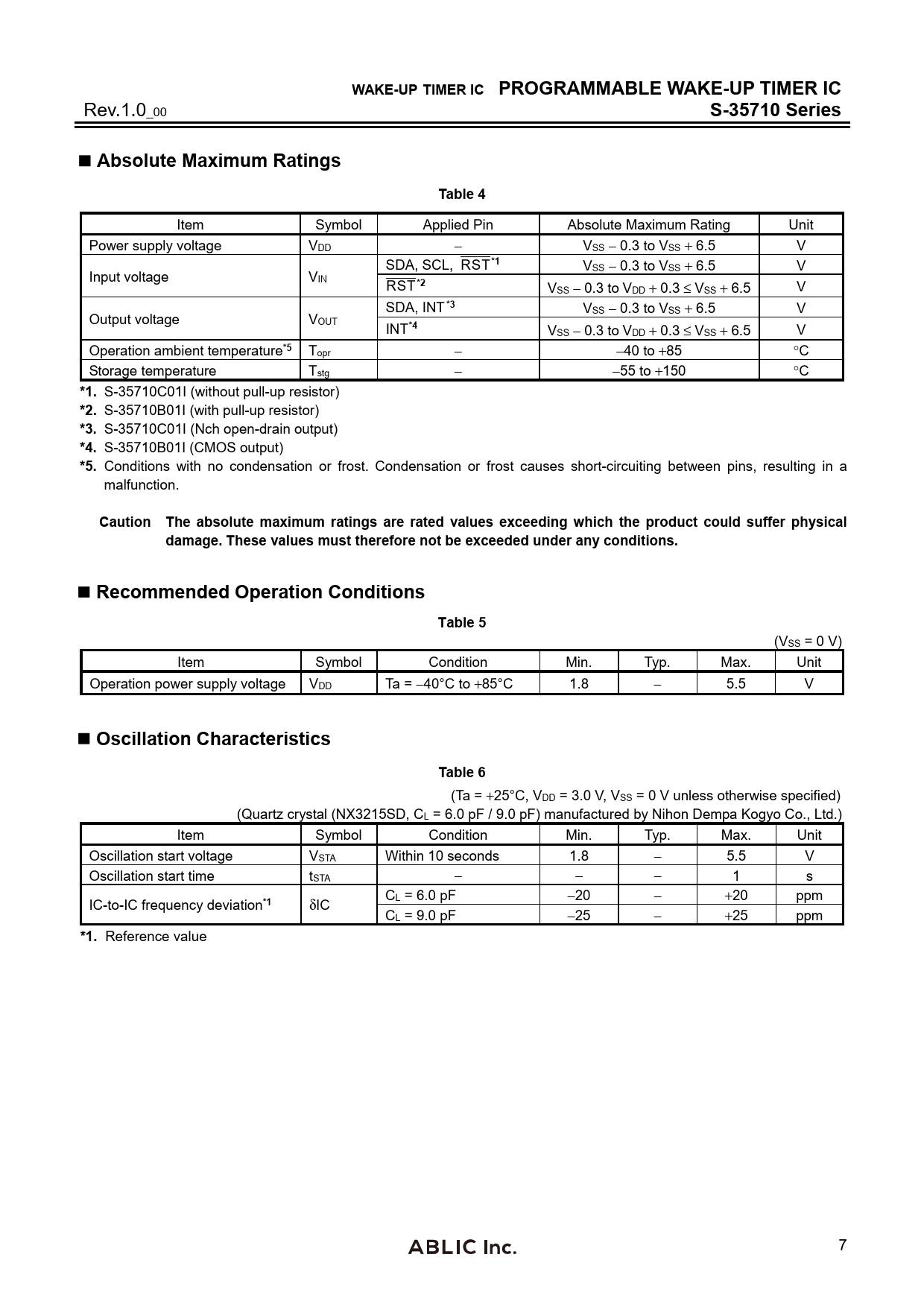 WAKE-UP TIMER IC PROGRAMMABLE WAKE-UP TIMER IC. S-35710 Series. Absolute Maximum Ratings. Table 4. *1. *2. *3. *4. *5