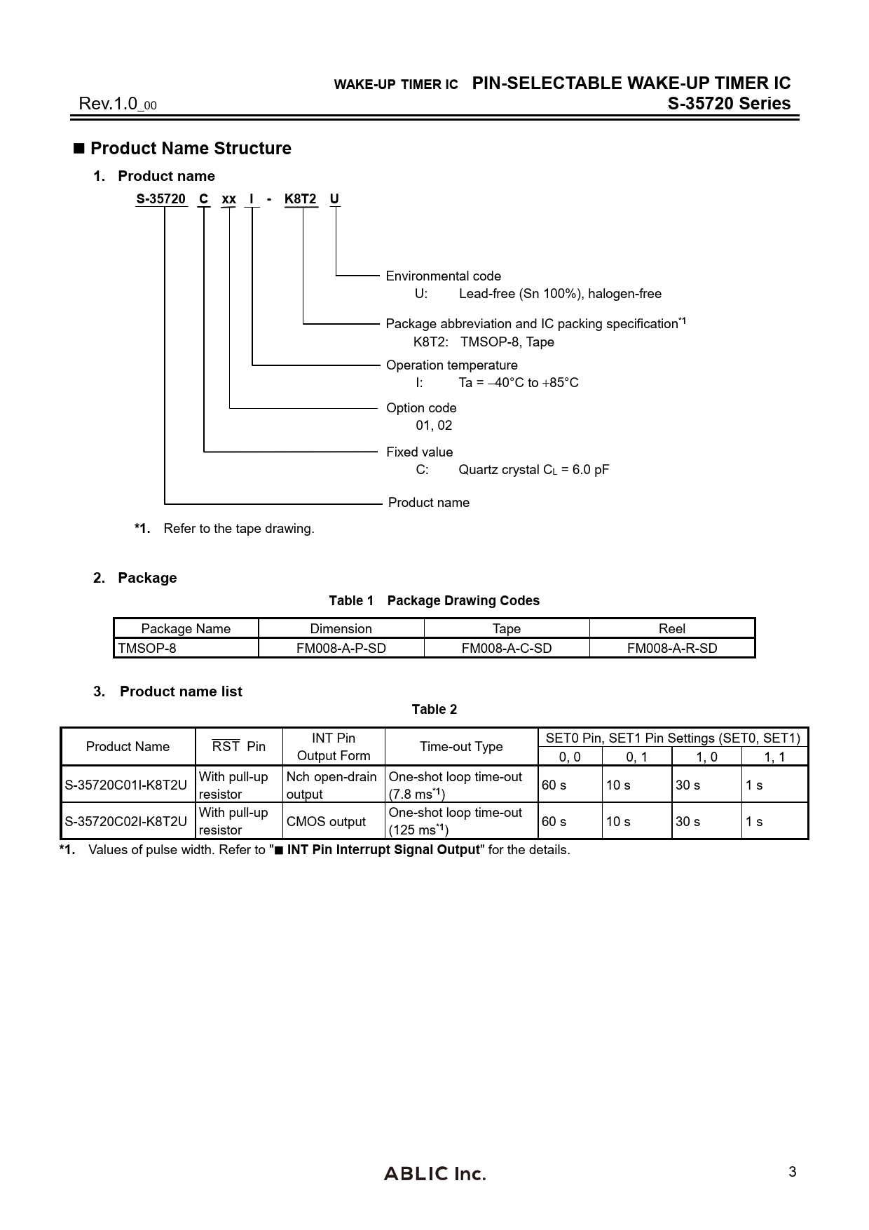 WAKE-UP TIMER IC PIN-SELECTABLE WAKE-UP TIMER IC. S-35720 Series. Product Name Structure. 1. Product name
