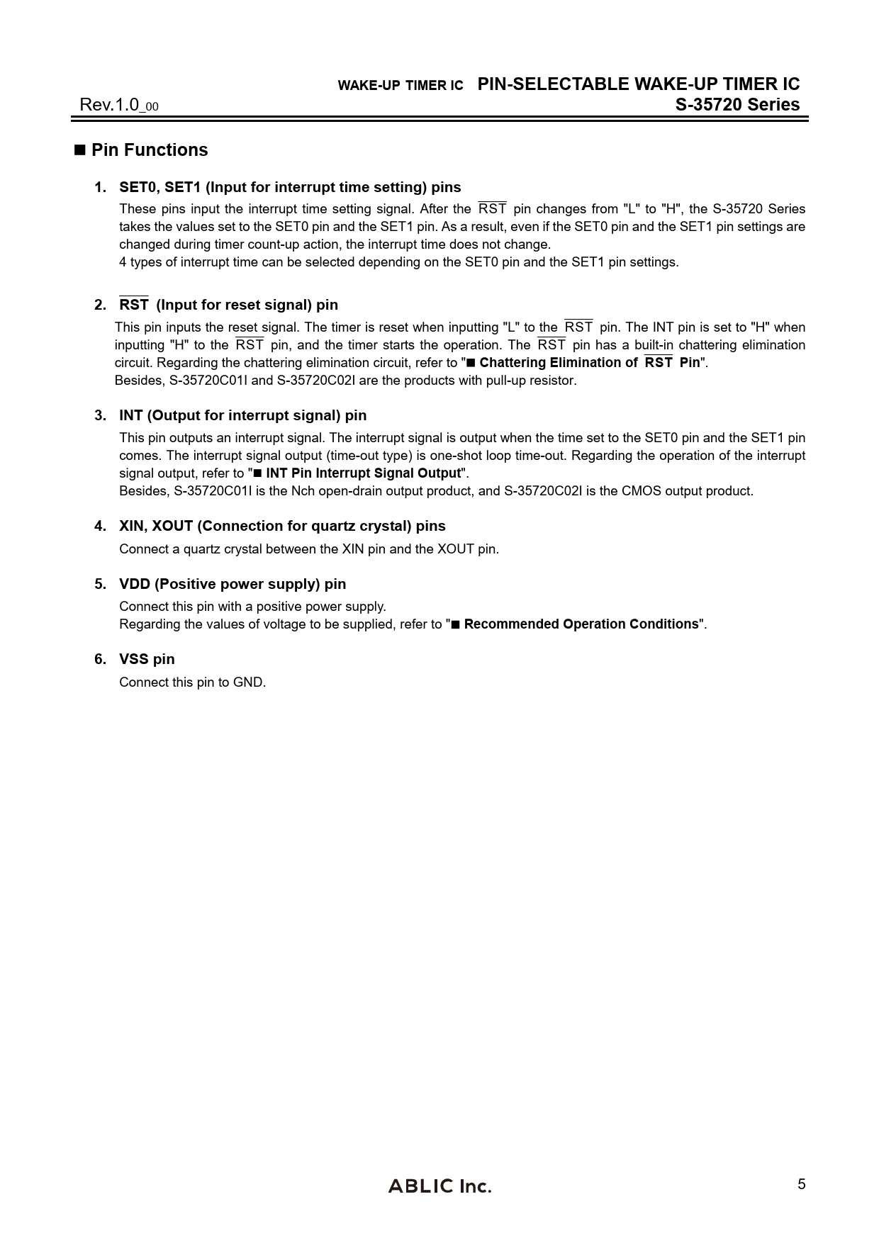 WAKE-UP TIMER IC PIN-SELECTABLE WAKE-UP TIMER IC. S-35720 Series. Pin Functions