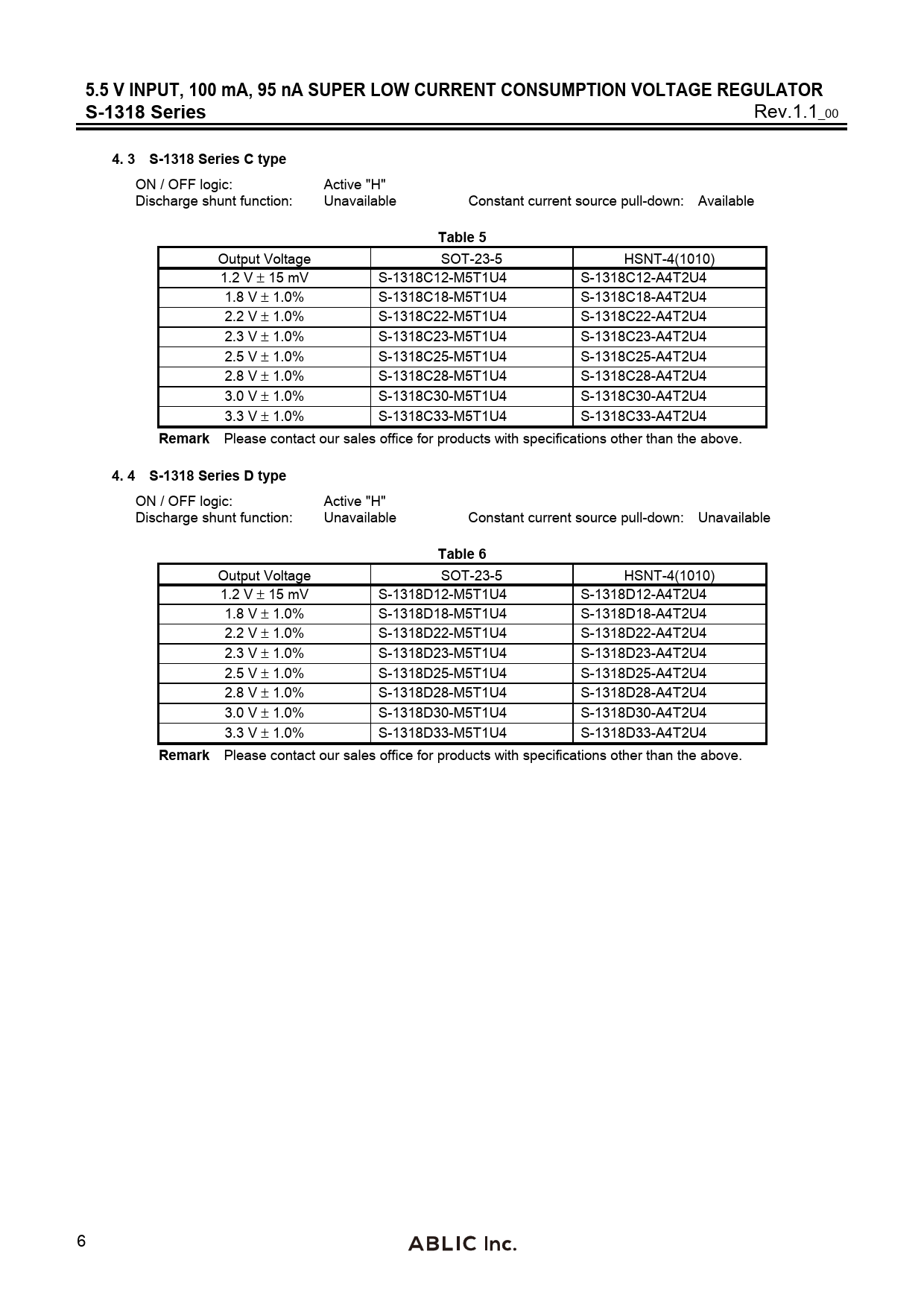 5.5 V INPUT, 100 mA, 95 nA SUPER LOW CURRENT CONSUMPTION VOLTAGE REGULATOR S-1318 Series Rev.1.1_00 4. 3 S-1318 Series C type ON / OFF logic: Active "H" Discharge shunt function: Unavailable Constant current source pull-down: Available Table 5 Output Voltage SOT-23-5 HSNT-4(1010) 1.2 V ± 15 mV S-1318C12-M5T1U4 S-1318C12-A4T2U4 1.8 V ± 1.0% S-1318C18-M5T1U4 S-1318C18-A4T2U4 2.2 V ± 1.0% S-1318C22-M5T1U4 S-1318C22-A4T2U4 2.3 V ± 1.0% S-1318C23-M5T1U4 S-1318C23-A4T2U4 2.5 V ± 1.0% S-1318C25-M5T1U4 S-1318C25-A4T2U4 2.8 V ± 1.0% S-1318C28-M5T1U4 S-1318C28-A4T2U4 3.0 V ± 1.0% S-1318C30-M5T1U4 S-1318C30-A4T2U4 3.3 V ± 1.0% S-1318C33-M5T1U4 S-1318C33-A4T2U4 Remark Please contact our sales office for products with specifications other than the above. 4. 4 S-1318 Series D type ON / OFF logic: Active "H" Discharge shunt function: Unavailable Constant current source pull-down: Unavailable Table 6 Output Voltage SOT-23-5 HSNT-4(1010) 1.2 V ± 15 mV S-1318D12-M5T1U4 S-1318D12-A4T2U4 1.8 V ± 1.0% S-1318D18-M5T1U4 S-1318D18-A4T2U4 2.2 V ± 1.0% S-1318D22-M5T1U4 S-1318D22-A4T2U4 2.3 V ± 1.0% S-1318D23-M5T1U4 S-1318D23-A4T2U4 2.5 V ± 1.0% S-1318D25-M5T1U4 S-1318D25-A4T2U4 2.8 V ± 1.0% S-1318D28-M5T1U4 S-1318D28-A4T2U4 3.0 V ± 1.0% S-1318D30-M5T1U4 S-1318D30-A4T2U4 3.3 V ± 1.0% S-1318D33-M5T1U4 S-1318D33-A4T2U4 Remark Please contact our sales office for products with specifications other than the above. 6 Document Outline 空白ページ 空白ページ 空白ページ 空白ページ