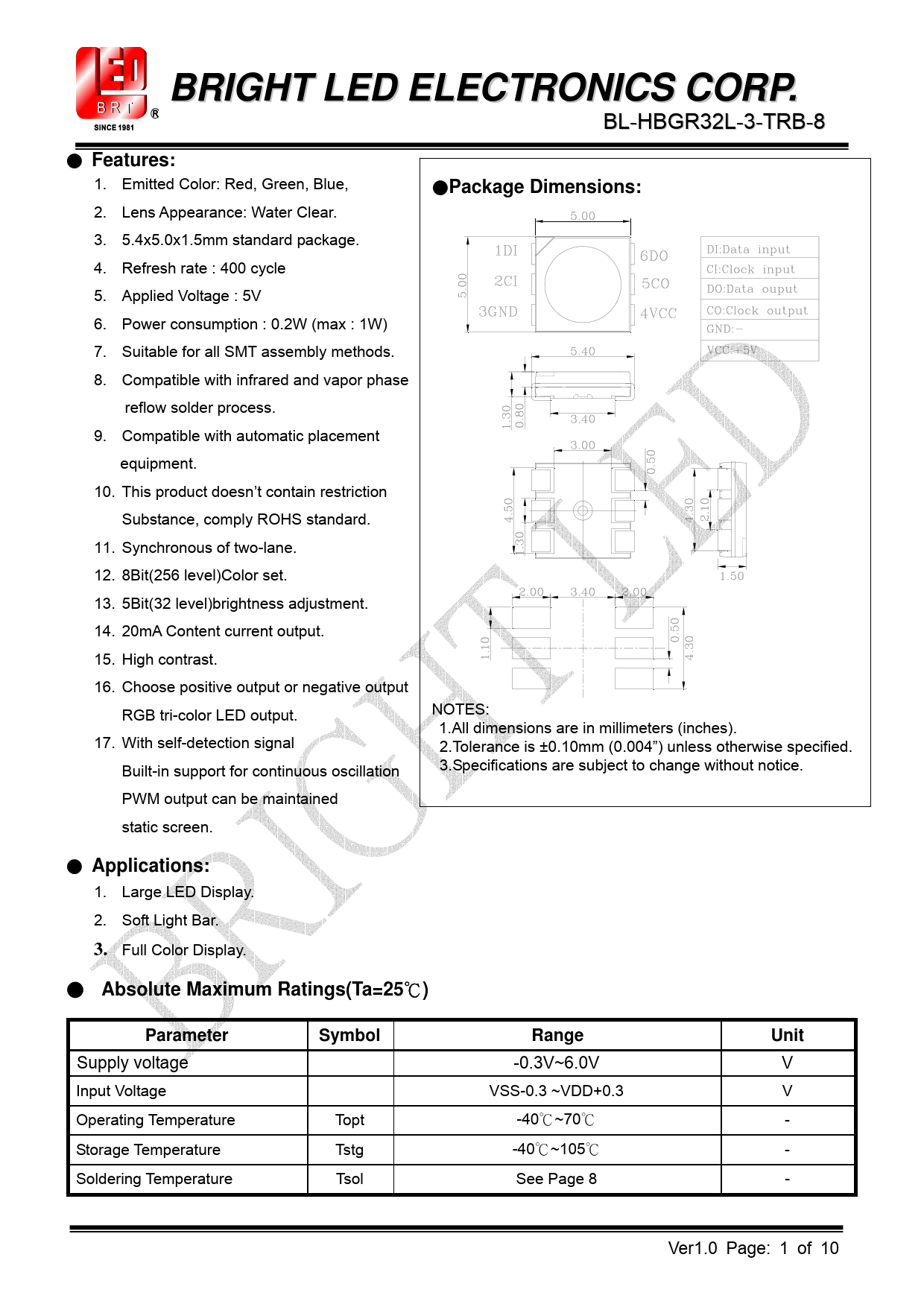 Páginas / Página10 / 1 — BRIGHT LED ELECTRONICS CORP. Features:. Package Dimensions:. …