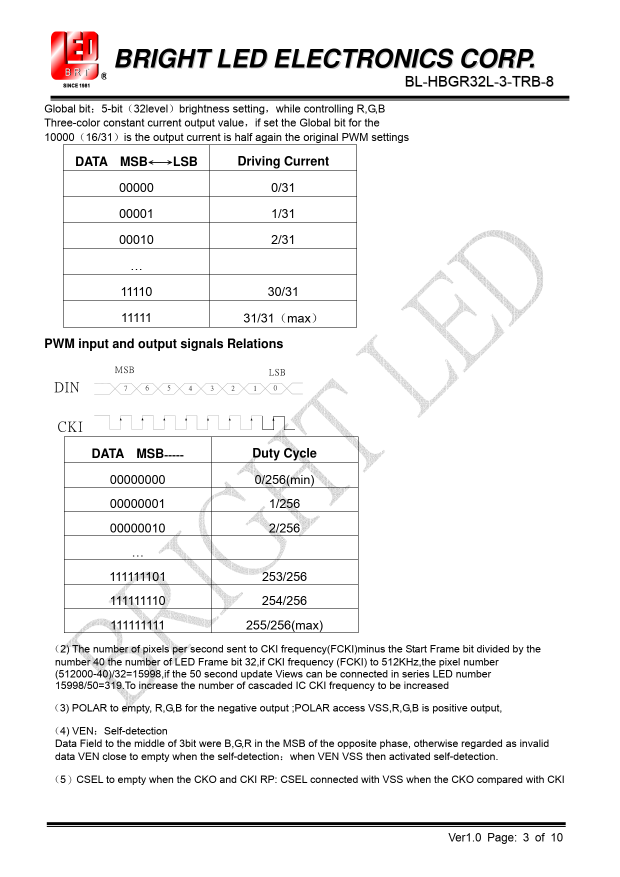 BRIGHT LED ELECTRONICS CORP. BL-HBGR32L-3-TRB-8 Global bit:5-bit(32level)brightness setting,while controlling R,G,B Three-color constant current output value,if set the Global bit for the 10000(16/31)is the output current is half again the original PWM settings DATA MSB ←→ LSBDriving Current 00000 0/31 00001 1/31 00010 2/31 … 11110 30/31 11111 31/31(max) PWM input and output signals Relations MSB LSB DIN 7 6 5 4 3 2 1 0 CKI DATA MSB ----- Duty Cycle 00000000 0/256(min) 00000001 1/256 00000010 2/256 … 111111101 253/256 111111110 254/256 111111111 255/256(max) (2) The number of pixels per second sent to CKI frequency(FCKI)minus the Start Frame bit divided by the number 40 the number of LED Frame bit 32,if CKI frequency (FCKI) to 512KHz,the pixel number (512000-40)/32=15998,if the 50 second update Views can be connected in series LED number 15998/50=319.To increase the number of cascaded IC CKI frequency to be increased (3) POLAR to empty, R,G,B for the negative output ;POLAR access VSS,R,G,B is positive output, (4) VEN:Self-detection Data Field to the middle of 3bit were B,G,R in the MSB of the opposite phase, otherwise regarded as invalid data VEN close to empty when the self-detection:when VEN VSS then activated self-detection. (5)CSEL to empty when the CKO and CKI RP: CSEL connected with VSS when the CKO compared with CKI Ver1.0 Page: 3 of 10
