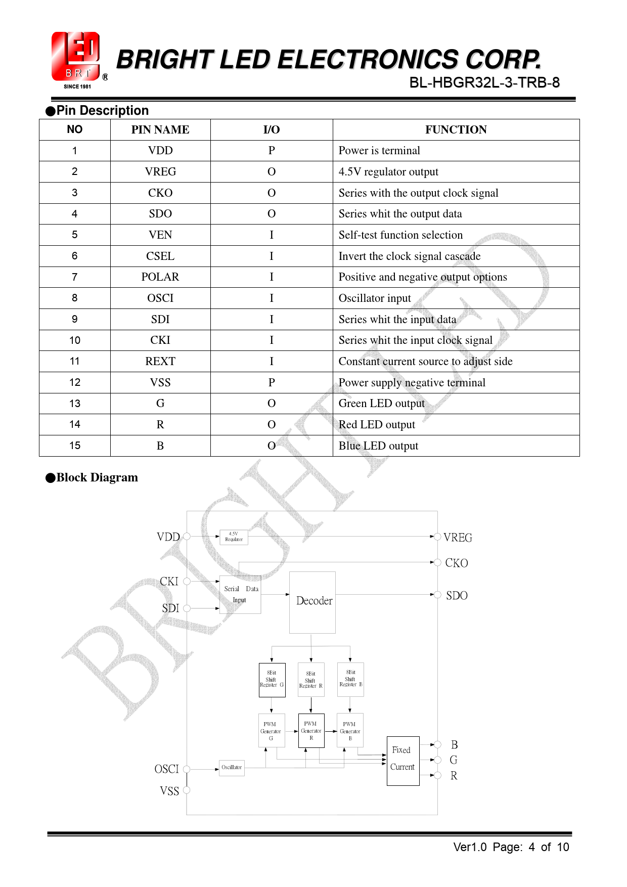 BRIGHT LED ELECTRONICS CORP. BL-HBGR32L-3-TRB-8 ● Pin DescriptionNOPIN NAMEI/OFUNCTION 1 VDD P Power is terminal 2 VREG O 4.5V regulator output 3 CKO O Series with the output clock signal 4 SDO O Series whit the output data 5 VEN I Self-test function selection 6 CSEL I Invert the clock signal cascade 7 POLAR I Positive and negative output options 8 OSCI I Oscillator input 9 SDI I Series whit the input data 10 CKI I Series whit the input clock signal 11 REXT I Constant current source to adjust side 12 VSS P Power supply negative terminal 13 G O Green LED output 14 R O Red LED output 15 B O Blue LED output ● Block Diagram 4.5V VDD Requlator VREG CKO CKI Serial Data SDO Input Decoder SDI 8Bit 8Bit 8Bit Shift Shift Shift Register G Register R Register B PWM PWM PWM Generator Generator Generator G R B B Fixed G Oscillator Current OSCI R VSS Ver1.0 Page: 4 of 10