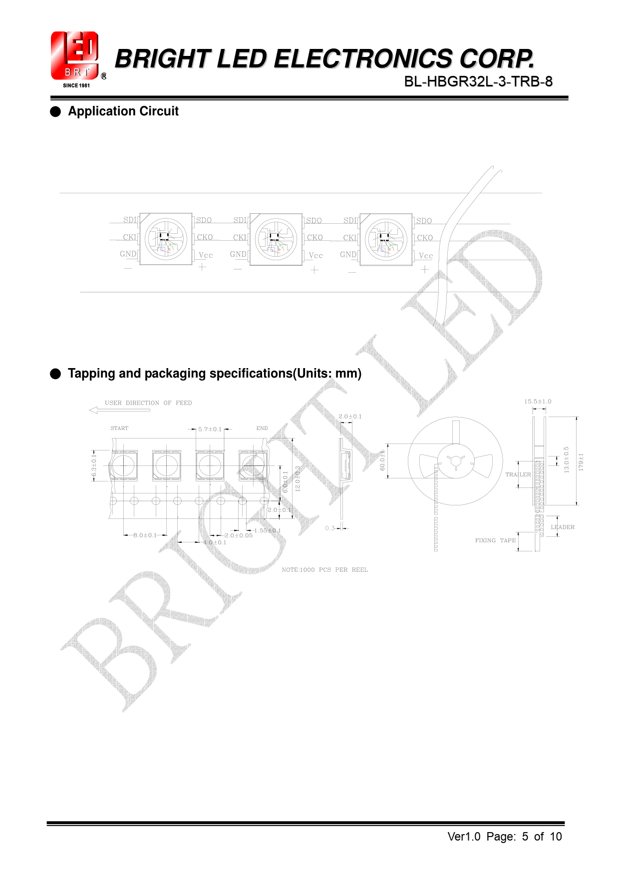 | Páginas / Página | 10 / 5 — BRIGHT LED ELECTRONICS CORP. Application Circuit. Tapping and packaging … |