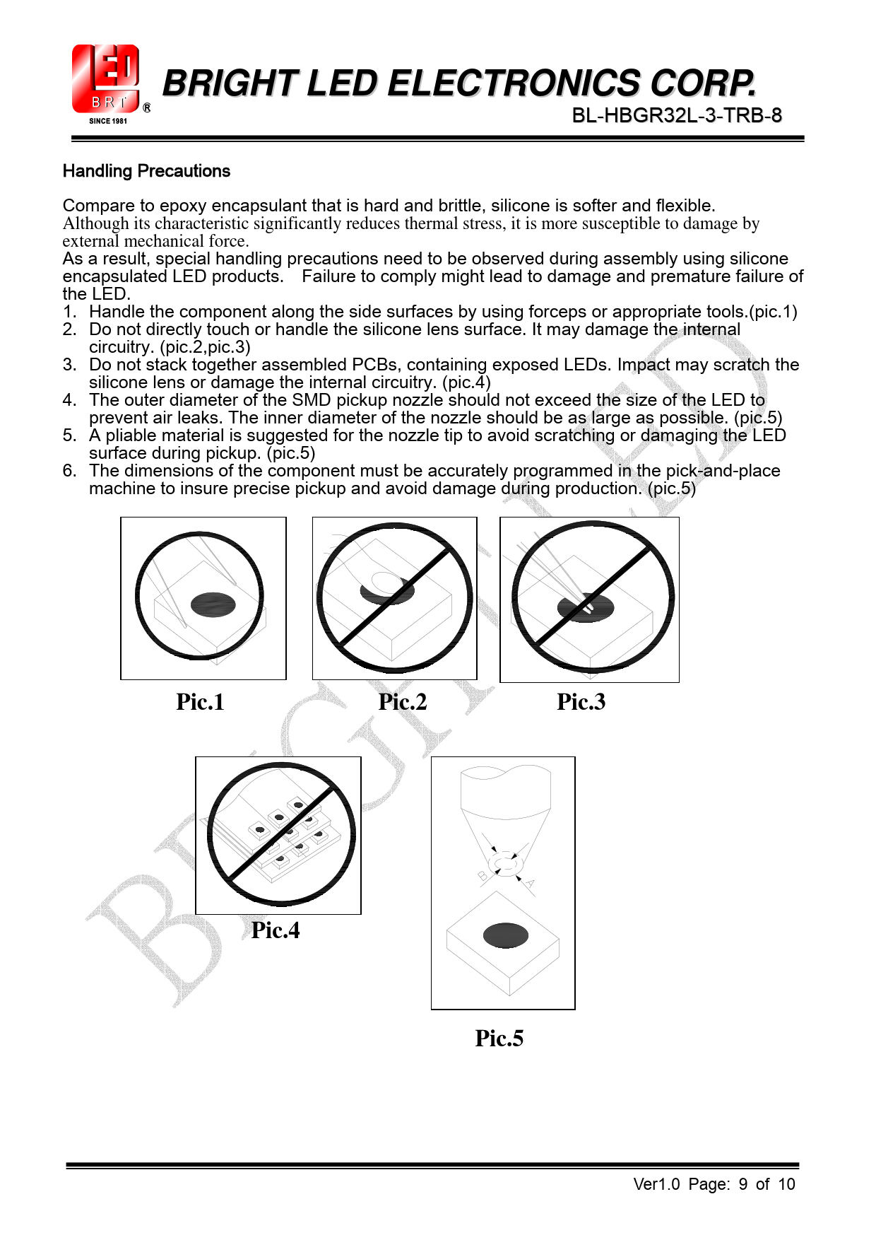 BRIGHT LED ELECTRONICS CORP. BL-HBGR32L-3-TRB-8 Handling Precautions Compare to epoxy encapsulant that is hard and brittle, silicone is softer and flexible. Although its characteristic significantly reduces thermal stress, it is more susceptible to damage by external mechanical force. As a result, special handling precautions need to be observed during assembly using silicone encapsulated LED products. Failure to comply might lead to damage and premature failure of the LED. 1. Handle the component along the side surfaces by using forceps or appropriate tools.(pic.1) 2. Do not directly touch or handle the silicone lens surface. It may damage the internal circuitry. (pic.2,pic.3) 3. Do not stack together assembled PCBs, containing exposed LEDs. Impact may scratch the silicone lens or damage the internal circuitry. (pic.4) 4. The outer diameter of the SMD pickup nozzle should not exceed the size of the LED to prevent air leaks. The inner diameter of the nozzle should be as large as possible. (pic.5) 5. A pliable material is suggested for the nozzle tip to avoid scratching or damaging the LED surface during pickup. (pic.5) 6. The dimensions of the component must be accurately programmed in the pick-and-place machine to insure precise pickup and avoid damage during production. (pic.5) Pic.1 Pic.2 Pic.3Pic.4Pic.5 Ver1.0 Page: 9 of 10