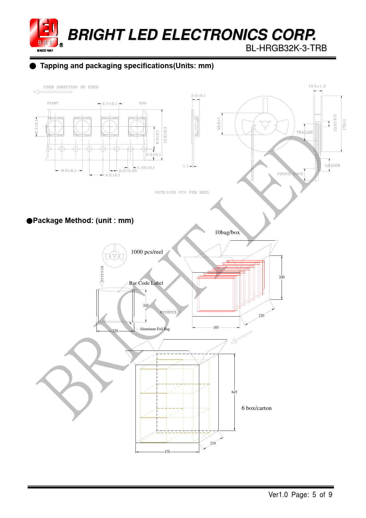 | Páginas / Página | 9 / 5 — BRIGHT LED ELECTRONICS CORP. Tapping and packaging specifications(Units: … |