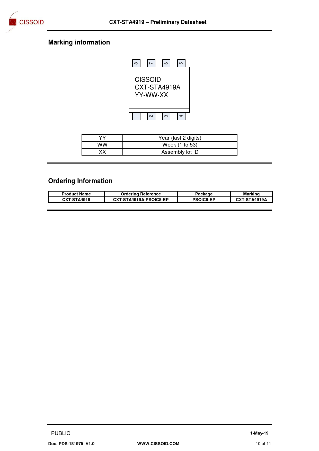 | Páginas / Página | 11 / 10 — CXT-STA4919 – Preliminary Datasheet. Marking information. Ordering … |
