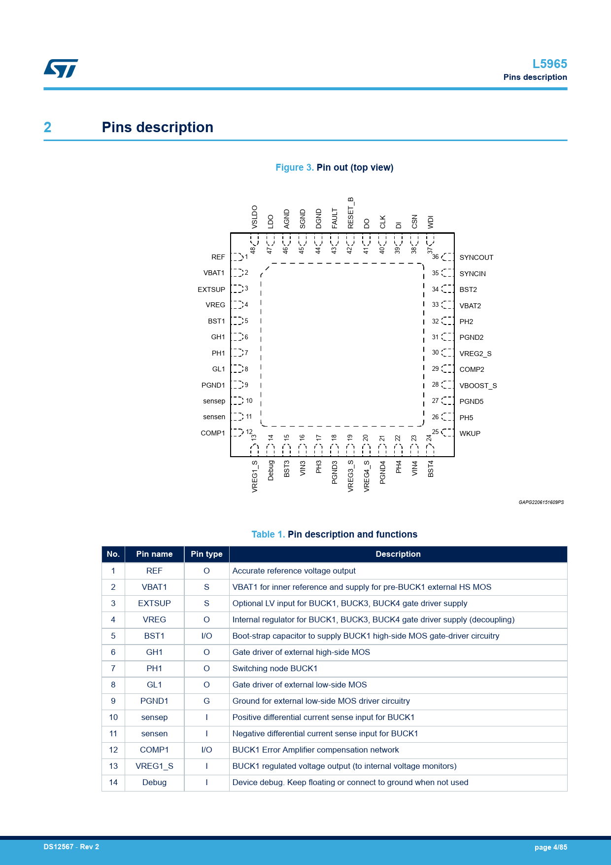 1 REF O Accurate reference voltage output 2 VBAT1 S VBAT1 for inner reference and supply for pre-BUCK1 external HS MOS 3 EXTSUP S Optional LV input for BUCK1, BUCK3, BUCK4 gate driver supply 4 VREG O Internal regulator for BUCK1, BUCK3, BUCK4 gate driver supply (decoupling) 5 BST1 I/O Boot-strap capacitor to supply BUCK1 high-side MOS gate-driver circuitry 6 GH1 O Gate driver of external high-side MOS 7 PH1 O Switching node BUCK1 8 GL1 O Gate driver of external low-side MOS 9 PGND1 G Ground for external low-side MOS driver circuitry 10 sensep I Positive differential current sense input for BUCK1 11 sensen I Negative differential current sense input for BUCK1 12 COMP1 I/O BUCK1 Error Amplifier compensation network 13 VREG1_S I BUCK1 regulated voltage output (to internal voltage monitors) 14 Debug I Device debug. Keep floating or connect to ground when not used