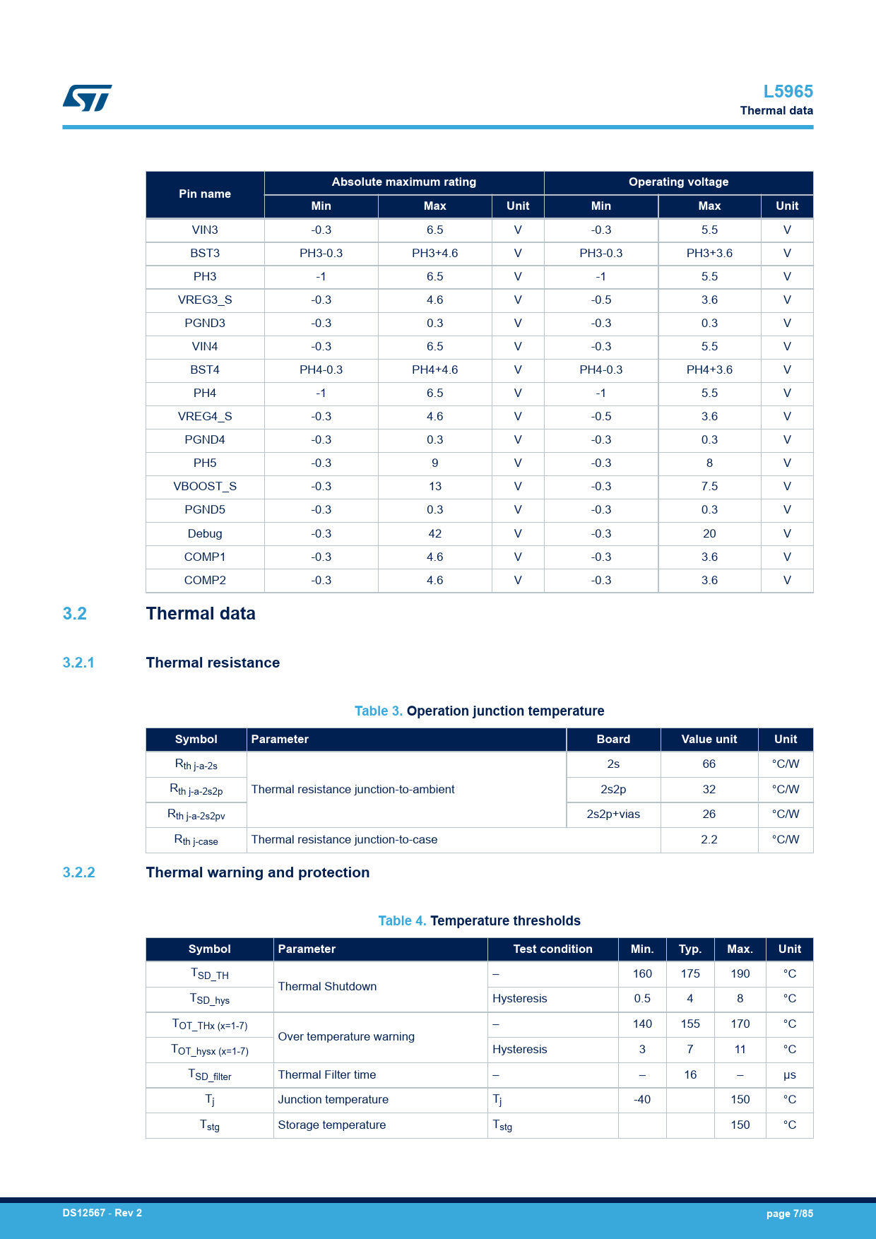 3.2.2 Thermal warning and protection Table 4. Temperature thresholds Symbol Parameter Test condition Min. Typ. Max. Unit