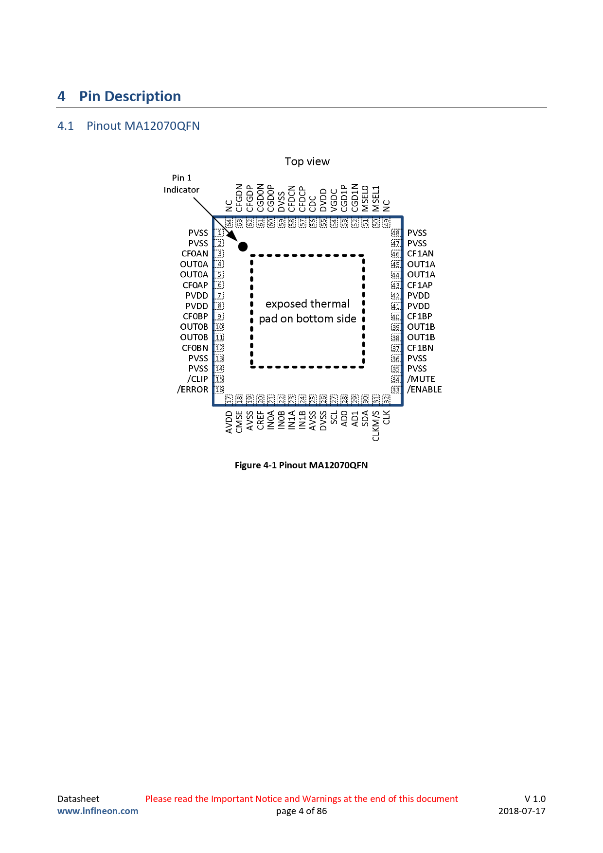 — 4 Pin Description. Figure 4-1 Pinout MA12070QFN. www.infineon.com