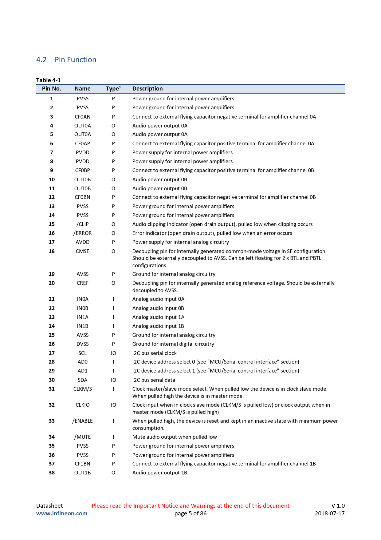 OUT1B O Audio power output 1B Datasheet Please read the Important Notice and Warnings at the end of this document V 1.0